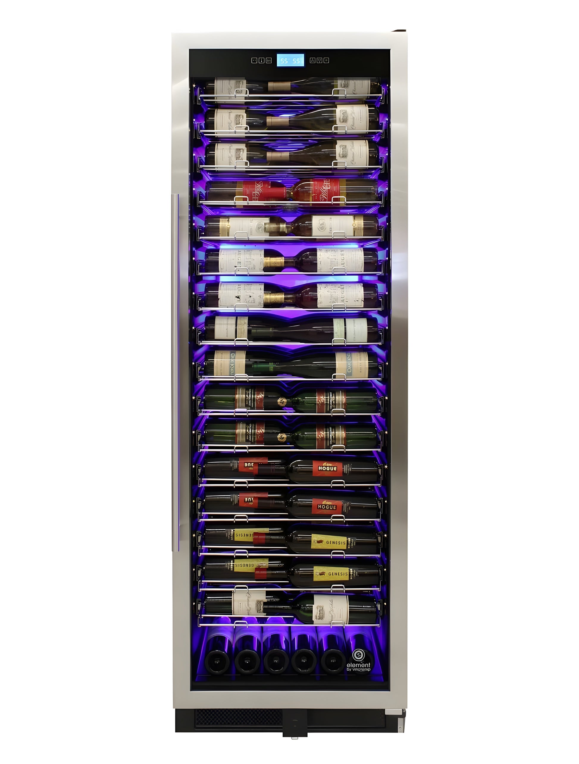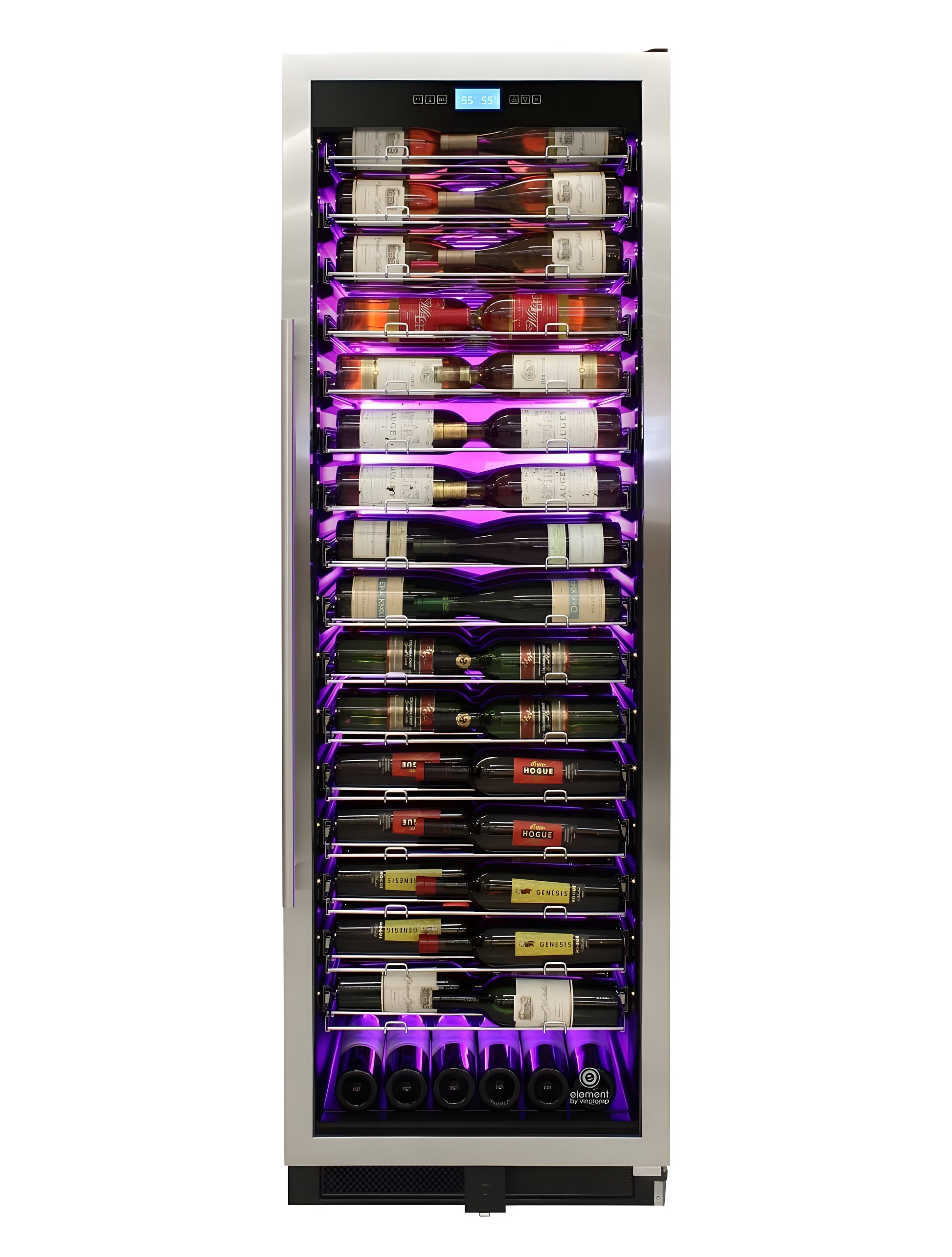 This elegant 141-Bottle Single-Zone Wine Cooler has innovative features such as telescopic shelves, label forward wine bottle display, interior Backlit in three different colors, and LED side lighting to maximize your display capability. This wine refrigerator is front venting with easy installation to build in and fit perfectly in any kitchen or bar area. The commercial style wine cooler is an entertainer's delight with three different color options to display whatever mood fits. The design forward wine cooler features vibration-damping design to better protect its contents and is engineered for low energy consumption and low noise. A digital temperature touchscreen controller located at the top of the cooler allows you to see and set the temperature without having to open the cooler door. Its patented interior Backlit panel has three different options - Heliotrope, Amber, and Vinotemp BioBlu (which helps reduce the growth of bacteria and mold) - and can be selected at any give time. Adjustable temperature range allows users to select a proper, customized storage and serving temperature for light or darker wines. Sturdy, stylish patented label forward VinBo Racks cradle bottles so the labels of wine stored are front facing while the racks glide and extend forward, adding to the cooler's visual appeal and function. A full glass door with stainless edge and door lock add to the style and functionality of this cooler. This wine cooler will make your large sized wine collection stand out.