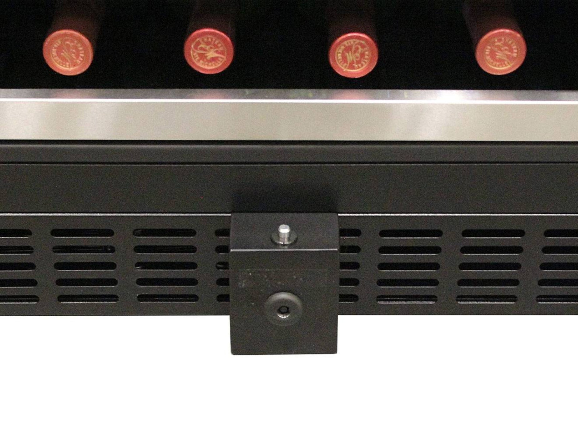 Store your wine at the optimal temperature in this attractive 155-bottle dual-zone wine cooler by Vinotemp. The EL-142TSST has 15 sturdy glide-out metal shelves with stainless lip, a black body and stainless steel trim and dual-paned glass door. The unit allows you to maximize your storage space with 13 full size shelves and 2 half size shelves with enough room to store 77 standard size bottles (750 mL) in the upper zone and 78 in the lower zone. The digital temperature controller is located at the top of the door, allowing you to set the temperature without having to open the door. Two adjustable temperature zones let you store red and white wines at their ideal temperatures to maintain the flavor. A front exhaust allows the unit to be built-in or freestanding. With a sleek frameless design, this wine cooler will be an excellent addition to your home. Available in both Right or Left hinge options.