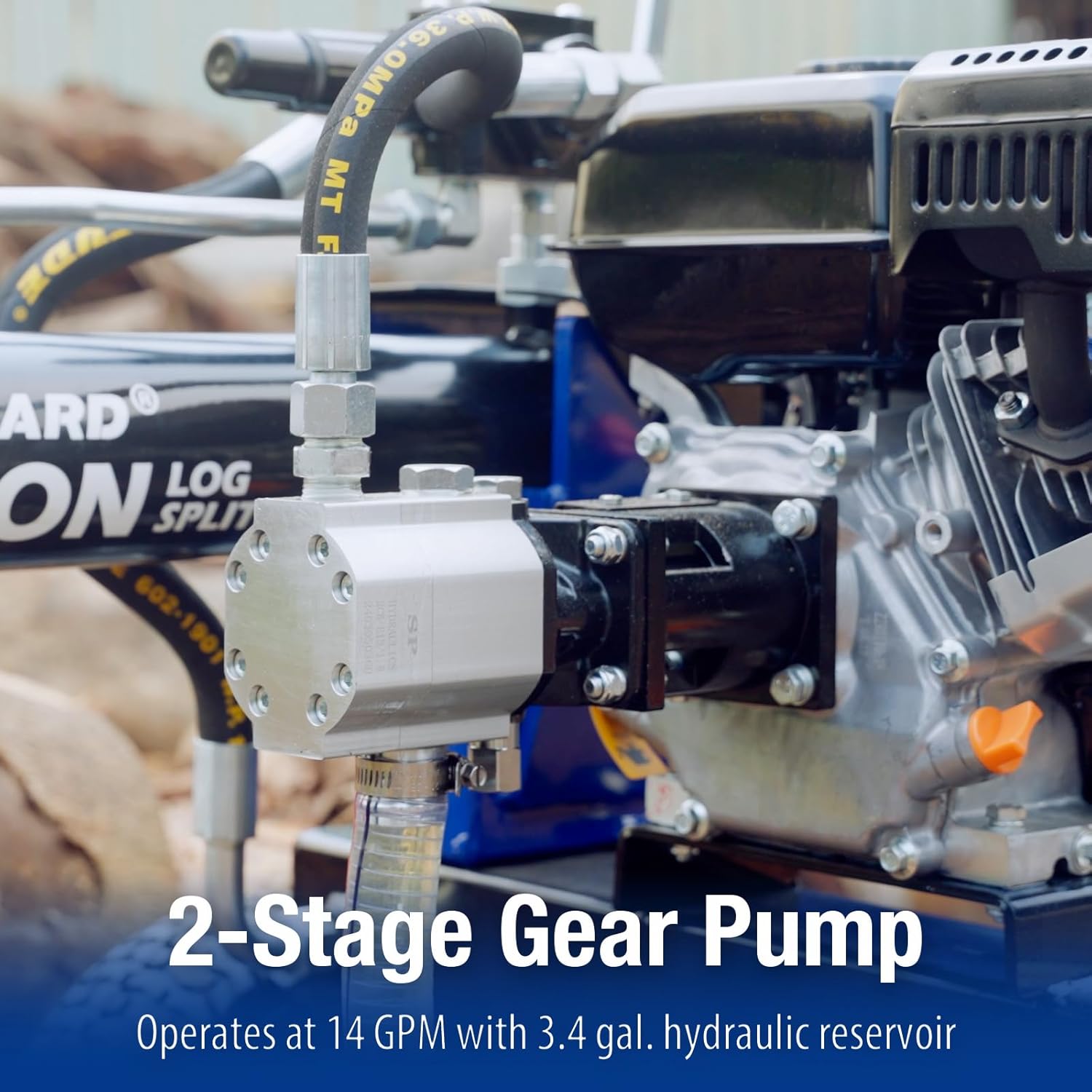 The log splitter features a robust hydraulic oil system that operates at 14 GPM, keeping contaminants at bay and extending the system's life. Both hydraulic and engine oils are included, so itβs ready to go out of the box.