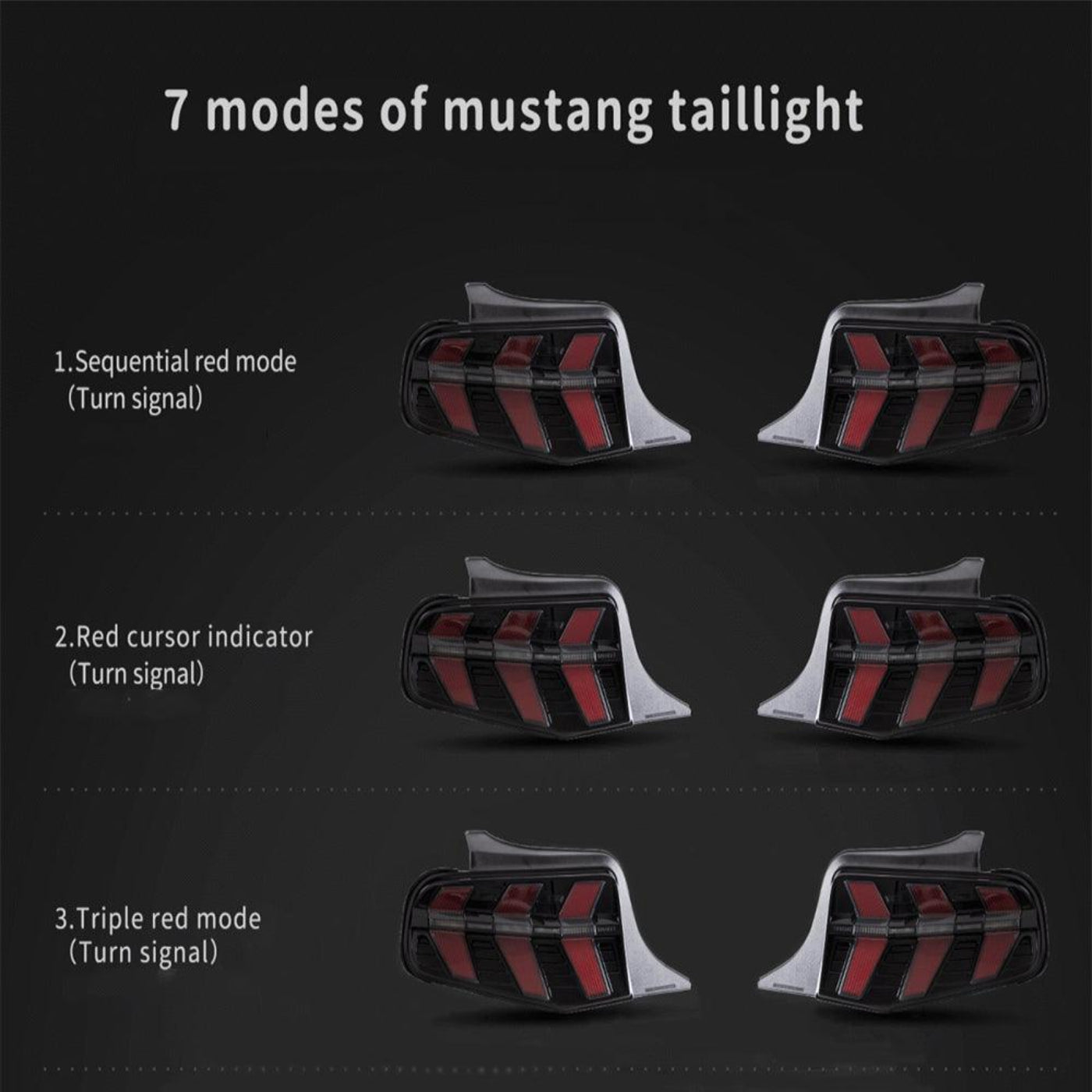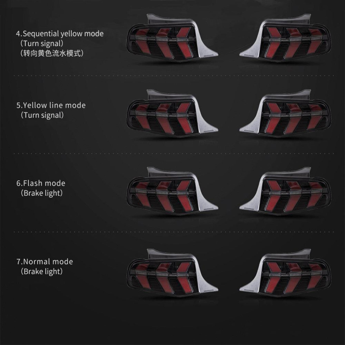 - Turn Signal/ Brake with 7-Lighting Modes- There are 1-Red Sequential Mode,2-Red Cursor Indicator Mode, 3-Red Triple Mode,4-Yellow Sequential Mode,5-Yellow Line Mode, Mode: 1-Flash Mode, and 2-Normal Mode. Lights have a row of LEDs that can be set up to run as switchbacks or solid signals according to your preference.