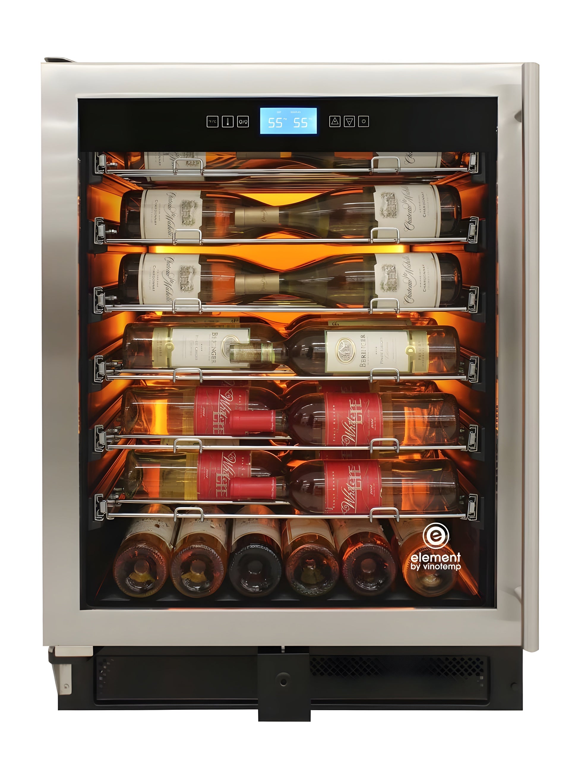 Store your wine collection in this elegant Vinotemp 41-Bottle Single-Zone Wine Cooler. Featuring seamless, all-glass technology, this wine refrigerator has room to store up to 41 bottles on six telescopic shelves and 1 bulk storage section. A digital temperature touchscreen controller located at the top of the cooler allows you to see and set the temperature without having to open the cooler door. Its patented interior Backlit panel lighting has three different color options - Heliotrope, Amber, and Vinotemp BioBlu (which helps reduce the growth of bacteria and mold) - and can be selected at any give time. This wine refrigerator is front venting with easy installation to build in and fit perfectly in any kitchen or bar area. Sturdy, stylish patented label forward VinBo Racks cradle bottles so the labels of wine stored are front facing while the racks glide and extend forward, adding to the cooler's visual appeal and ease of use. A full glass door with stainless steel edge and door lock add to the style and functionality of this cooler. This wine cooler will make your small to medium sized wine collection stand out.