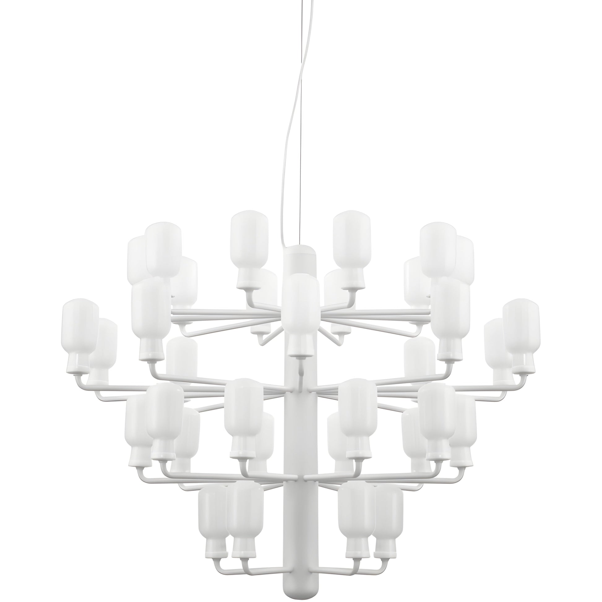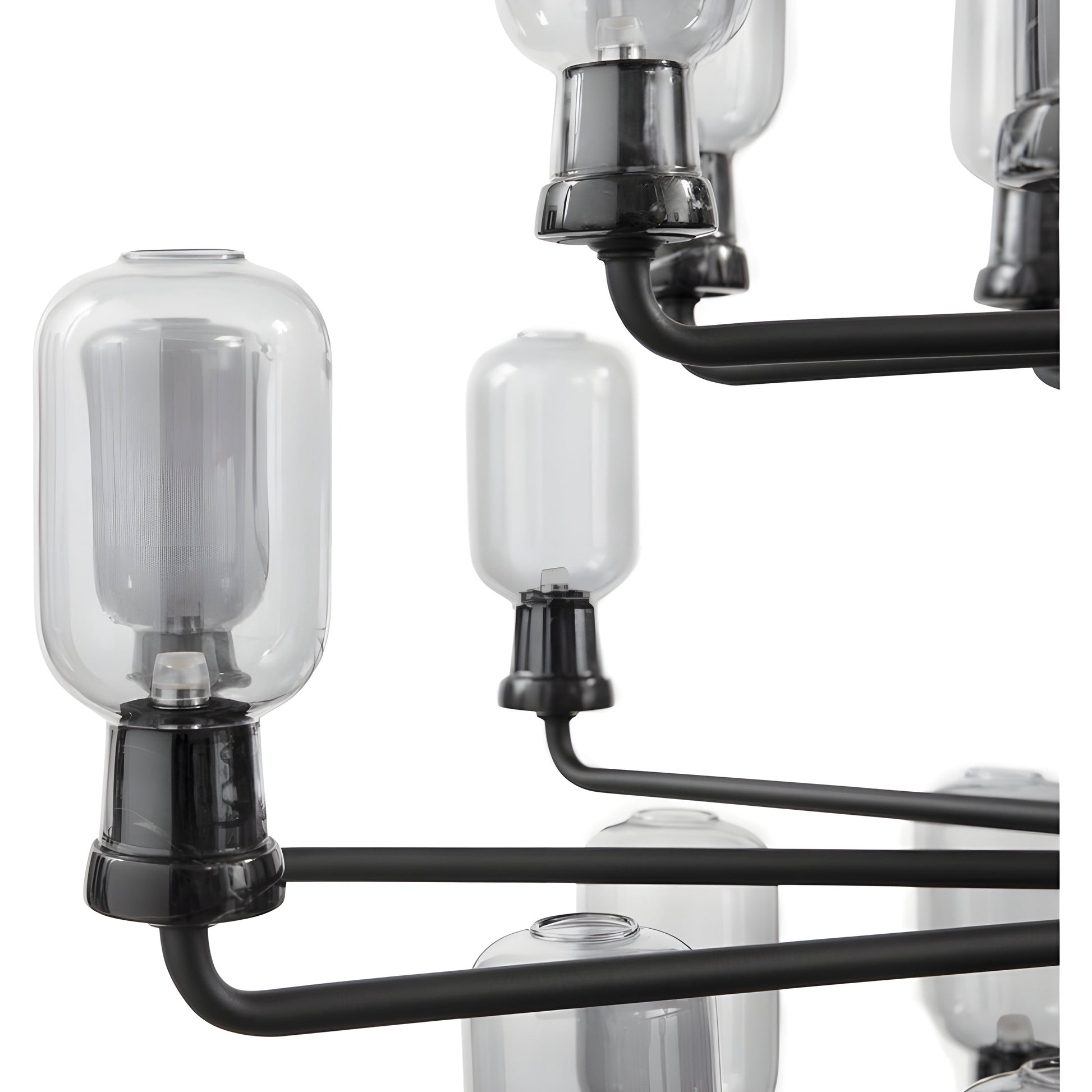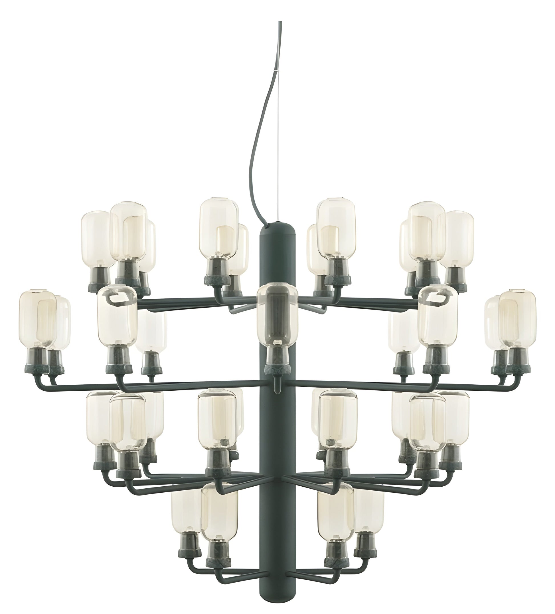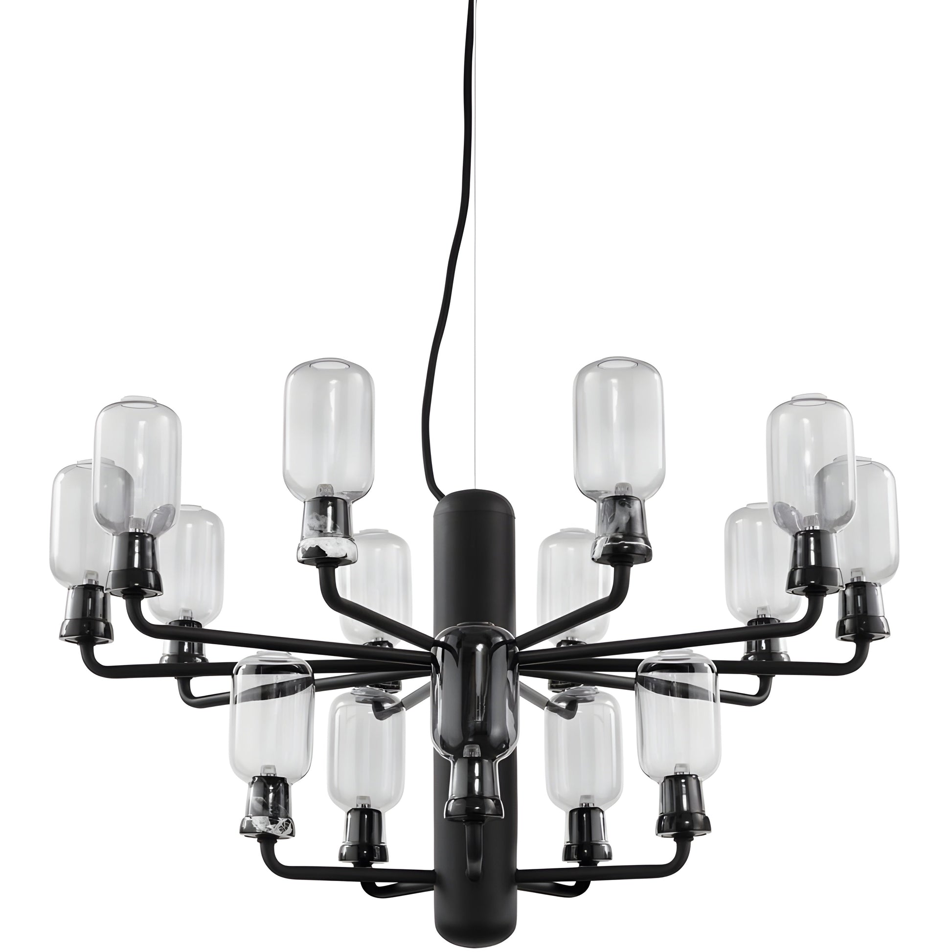 The Amp Chandelier by Normann Copenhagen is a striking mix of classic and modern design. Inspired by 1960s tube amplifiers, designer Simon Legald used glass shades and solid marble accents to create a refined look. Its sculptural shape gives off a nostalgic yet contemporary feel. Available in multiple colors, it blends seamlessly into a modern lighting setup.Â