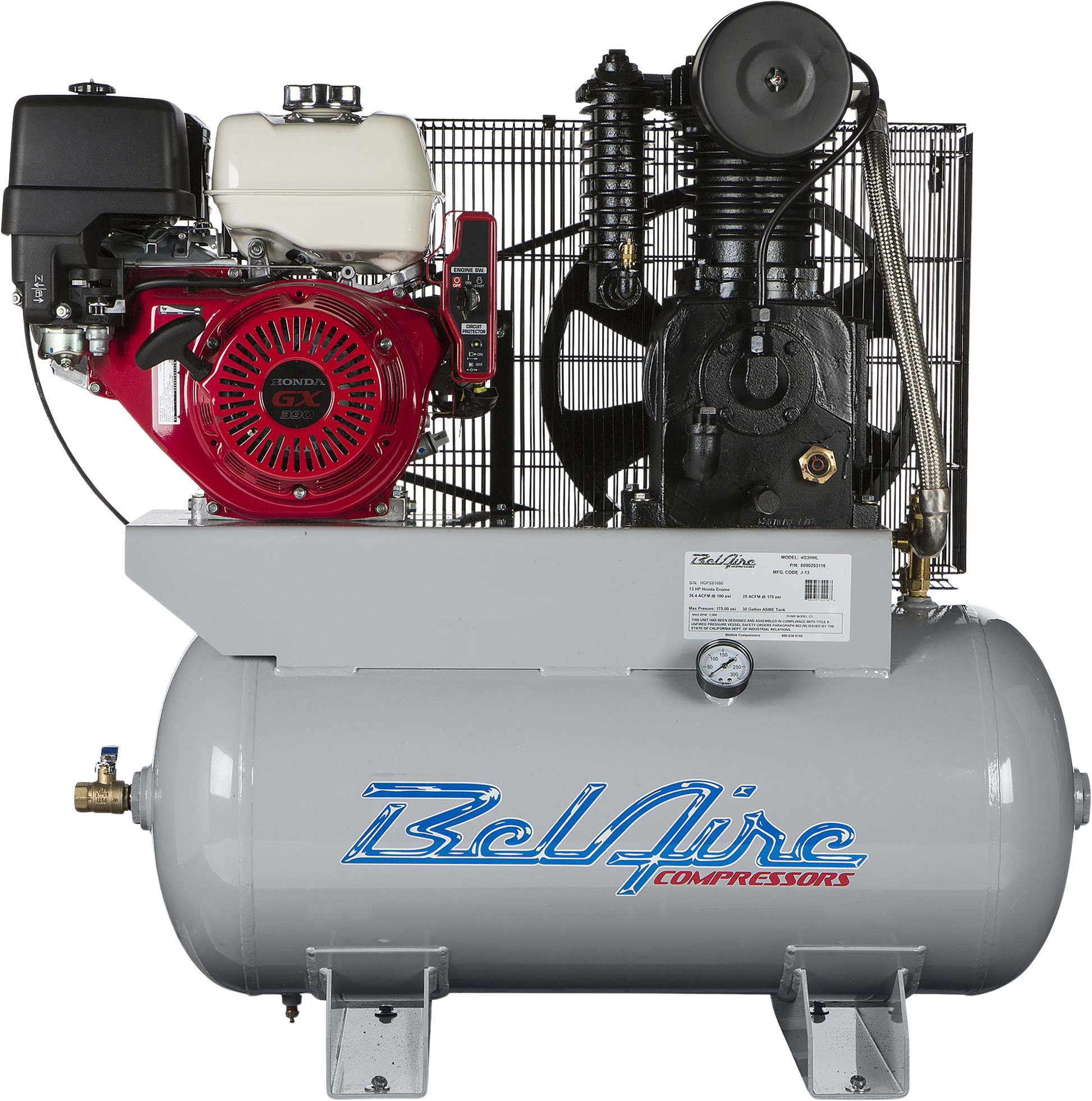 Belaire's Iron Series gas drive air compressor gives you a heavy duty cast iron pump and plenty of air for your service truck. It features a 13HP Honda engine, 30 gal. ASME horizontal tank, and a max pressure of 175psi. This compressor also comes with a 2 year Bumper to Bumper warranty.