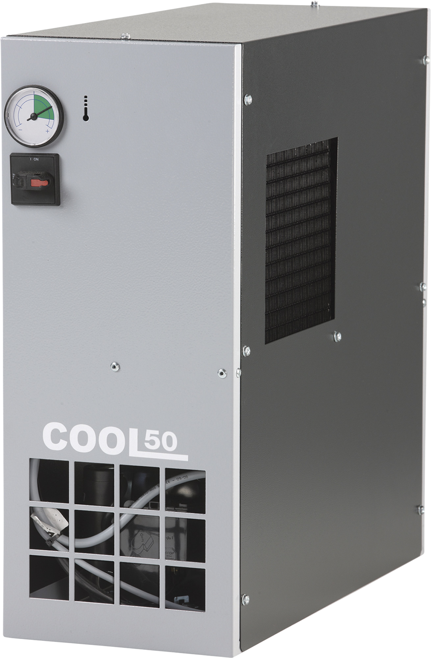 Cool down your compressed air with the Cool 50 refrigerated air dryer. This non-cycling air dryer is rated for up to 50 CFM and can reach a pressure dew point of 50°F. It features zero loss automatic drainage, dumping accumulated water without wasting air. This air dryer works with most compressor technology and runs on standard 115V single phase power.