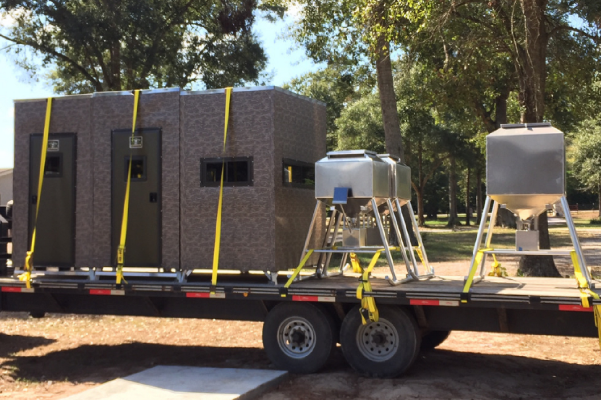 Premium Insulation & Features - deer blinds are framed and the decking and insulation is installed, we then add great features like insulated and functional windows and door. We top things off with shelf rests.