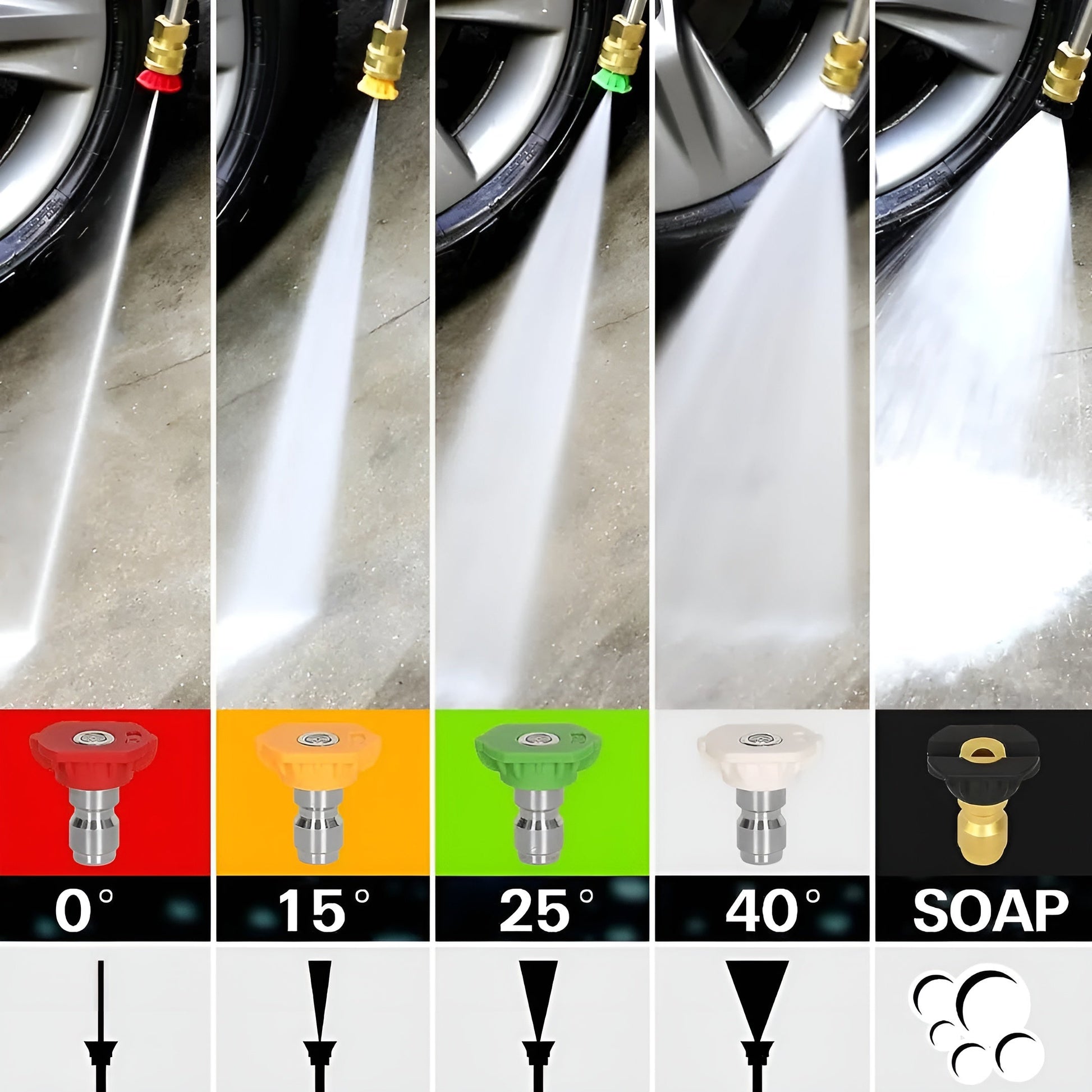 Experience cleaning precision like never before with our 5 Quick Connect Nozzle Tips. Each tip is color-coded for ease: 0°(red), 15°(orange), 25°(green), 40°(white), and soap(black). From high-impact water beams to soft scattering, you can now effortlessly tackle all surfaces. Whether it's metal, walls, pavement, wood decks, glass, or even cars, consider every cleaning challenge met.
