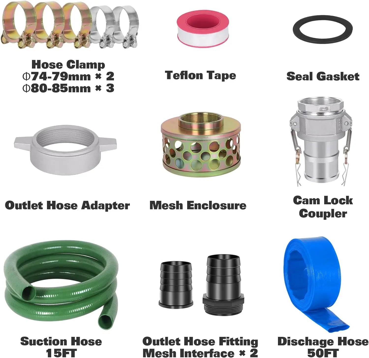 Complete and Convenient Fittings: This trash pump comes with all the necessary fittings for easy setup, including a 50 ft discharge hose, 15 ft suction hose, seal gasket, cam lock coupler, mesh interface, mesh enclosure, clamps, fittings, and adapters. Remember to use sealing tape when connecting hoses to the water pump to prevent leaks.