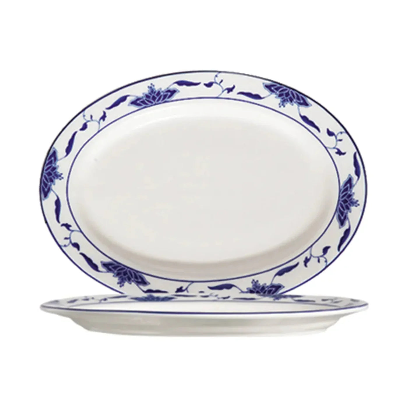 A: Features a classic oval shape with a clean white finish, offering a timeless presentation for various food types.