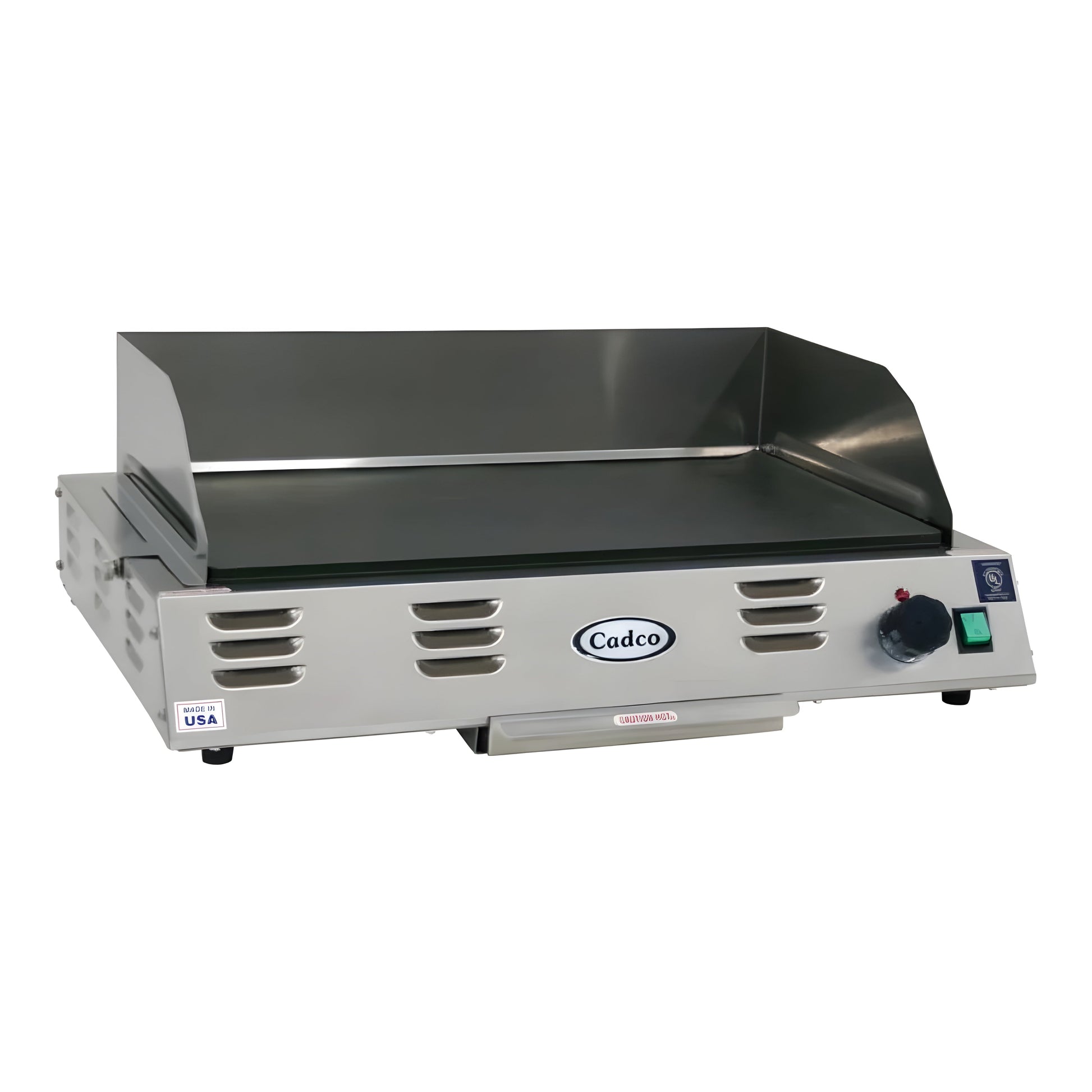 The Cadco 21" x 12" Electric Countertop Griddle is a compact yet powerful griddle, ideal for commercial kitchens with limited space. Featuring a 252 square inch cast iron cooking surface, it provides ample room to cook a variety of items at once. The griddle operates at 1,500 watts and reaches up to 450°F, ensuring quick and even heating across the surface. Built with stainless steel construction, side splashes, and sturdy feet, this griddle is durable, easy to clean, and designed to fit seamlessly into any countertop setup.