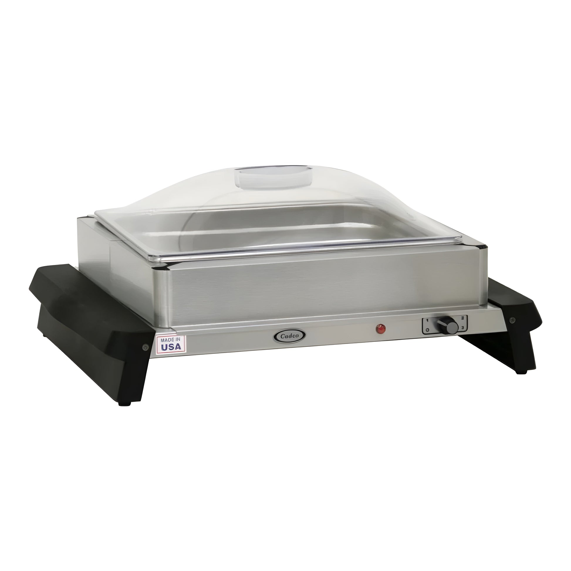 The Cadco WTBS-12P Electric Buffet Server with Clear Lid is a high-performance solution designed to keep food warm and ready for service in commercial settings such as buffets, catering events, and food service establishments. This buffet server measures 18 1/4 inches in width, 15 1/4 inches in depth, and stands 7 7/8 inches tall, making it compact yet spacious enough to hold a half-size pan. Constructed from durable stainless steel, it features a sleek black and silver design that enhances any presentation. Operating at 120 volts with a wattage of 300 watts, this server utilizes a single heating zone to maintain food temperatures within a range of 155°F to 205°F. The user-friendly dial control allows for easy temperature adjustments, while the heated shelves ensure food remains at the ideal serving temperature. The clear lid allows for visibility while keeping contents covered, enhancing food safety and presentation. As an NSF listed product, it meets stringent health standards, and the included handle provides ease of transport, making it perfect for self-service stations.