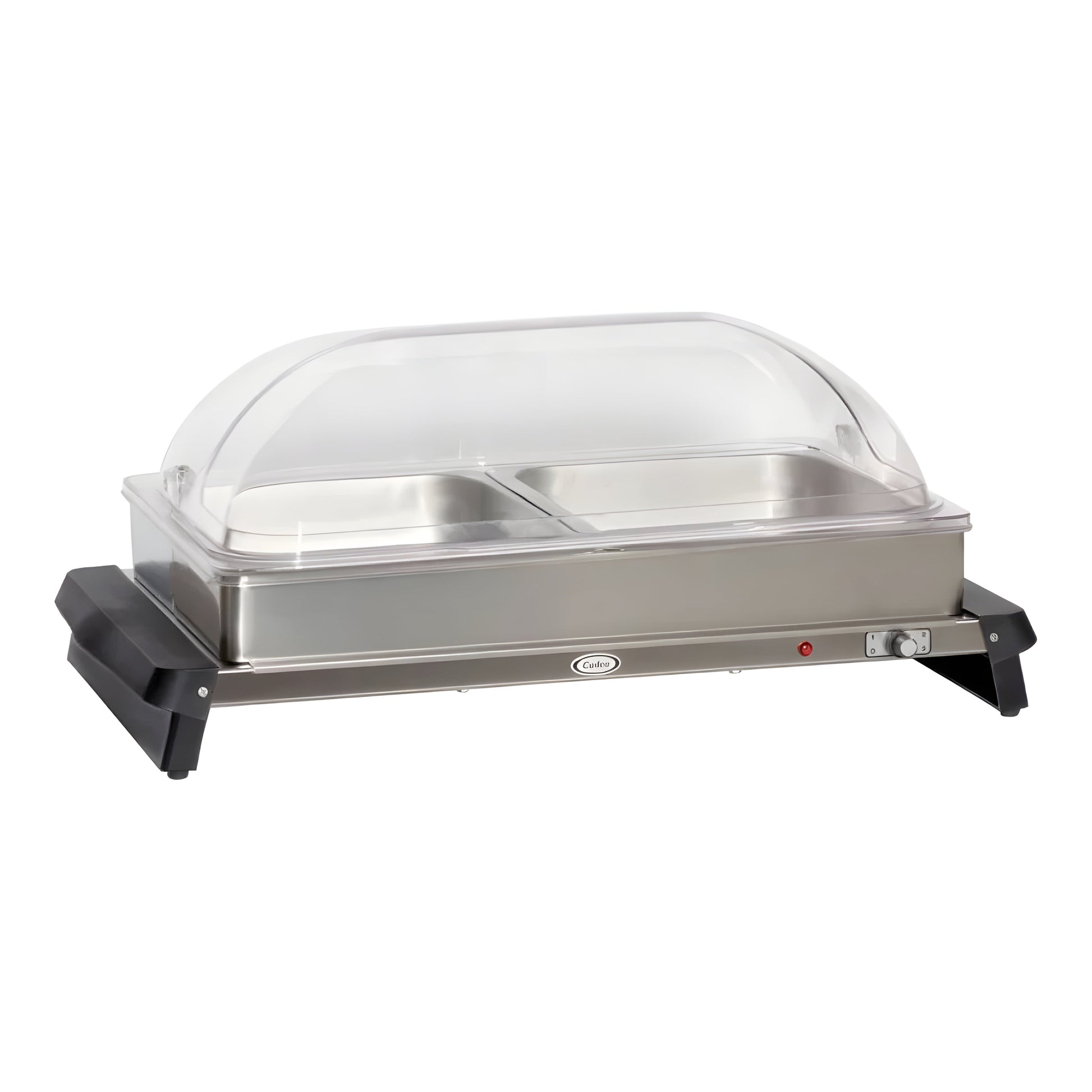 The Cadco WTBS-2RT 2-Compartment Half Size Electric Buffet Server is an essential piece for any catering service or buffet line, designed to keep food warm and easily accessible for self-service. With a sleek stainless steel construction and a stylish roll top lid, this buffet server provides a professional appearance while ensuring food remains at an optimal serving temperature. The server features two compartments, each capable of holding a half-size pan, making it versatile for various dishes. It operates at 300 watts and maintains temperatures ranging from 155 to 205 degrees Fahrenheit, thanks to its efficient metal sheathed heating element. Easy to operate with a dial control, this unit is also NSF listed for safety and sanitation, making it a reliable choice for food service environments.