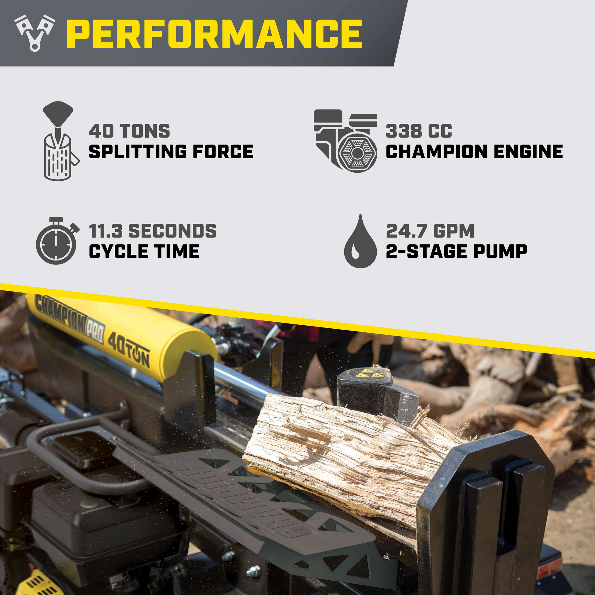 Champion’s PRO series towable 40-ton log splitter with its massive 338cc engine is designed for professional loggers and firewood suppliers. With rugged features like an adjustable, dual-wheel support leg and steel engine guard, easily power through tough logs with the fast 11.3-second cycle time and auto-return valve, while the handy log catchers and easy adjustment from horizontal to vertical save your back.