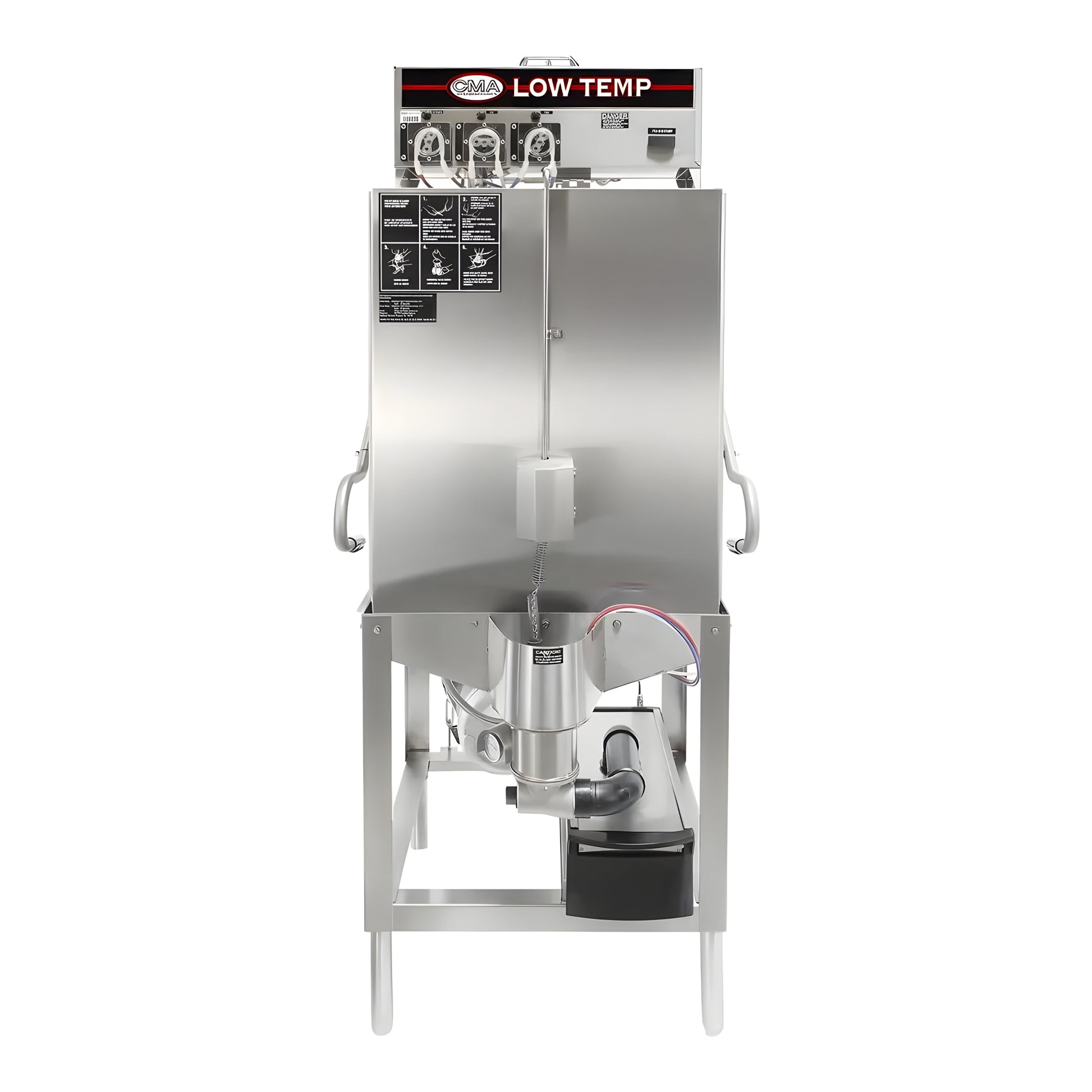 Constructed entirely from stainless steel, the CMA S-AH is built for durability and long-term use. It includes a top-mounted control box with chemical pumps and a deliming system to assure proper chemical usage and maintenance. The unit also includes one dishrack and operates with a standard 115V electrical connection.