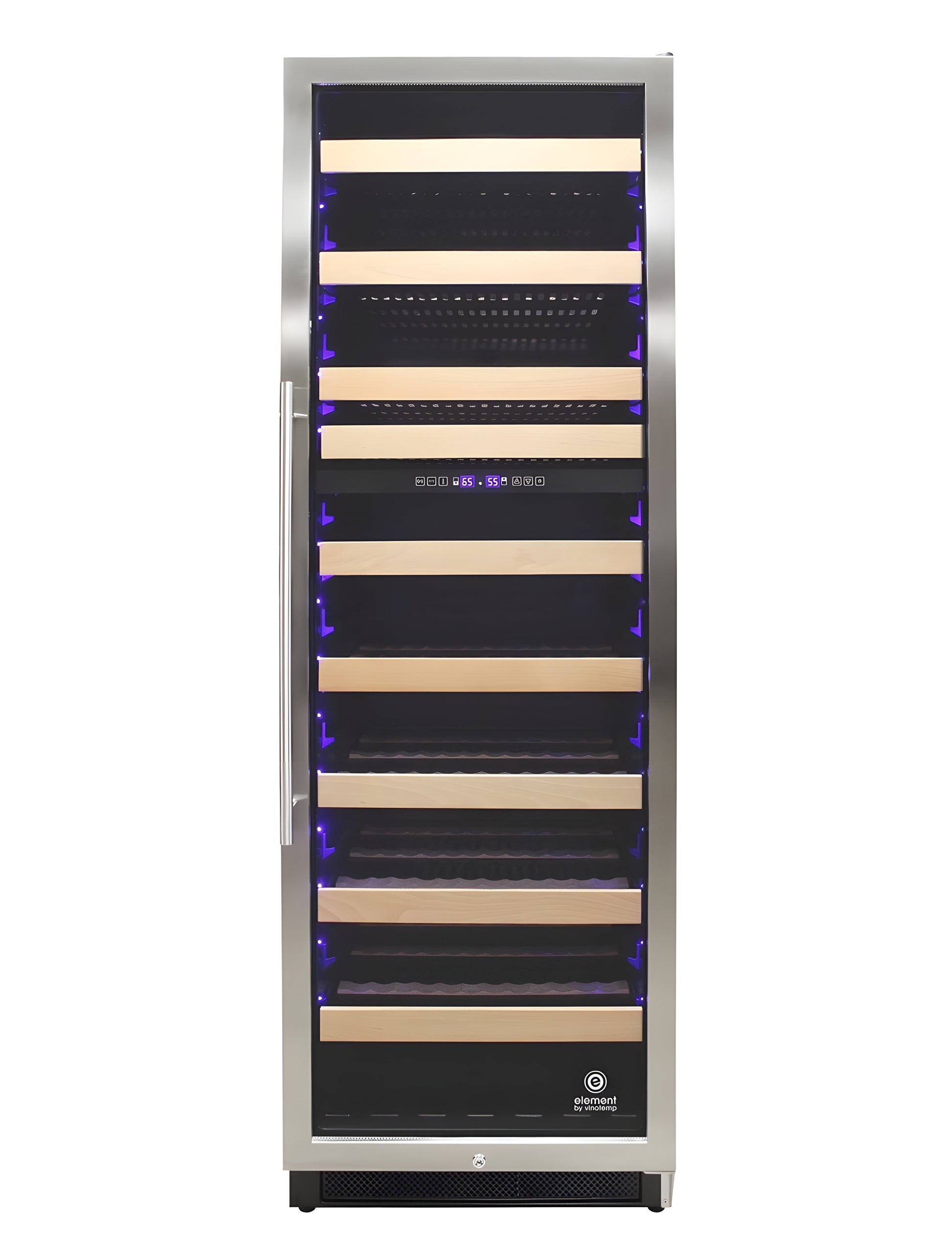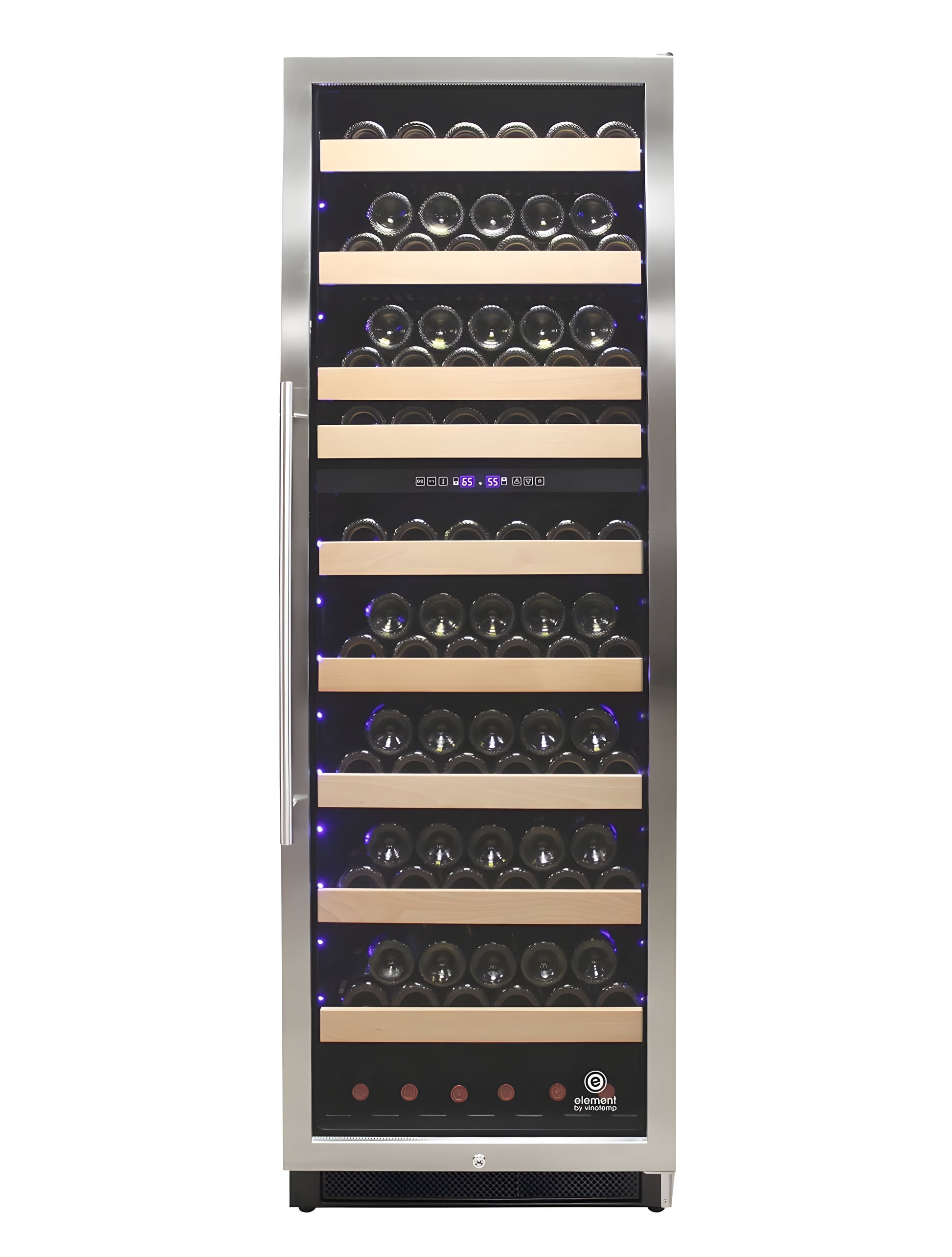 Vinotemp’s Connoisseur Series 168 Dual Zone Wine Cooler is a must-have for the avid wine collector. With two independent temperature zones, this unit is perfect for storing both red and white wines at their optimum temperatures. Specially designed racking has secure-hold grooves that ensure each bottle stays securely in place. A centrally located digital control panel allows you to monitor and adjust the temperature of this cooler. An insulated glass door with seamless stainless steel trim is accented by a modern pole handle, giving this large capacity wine cooler a touch of luxury. This unit has front venting which allows it to be either installed built-in or freestanding. Store larger sized Champagne and Magnum bottles in the areas designated for bulk storage.Vinotemp’s Connoisseur Series 168 Dual Zone Wine Cooler is a must-have for the avid wine collector. With two independent temperature zones, this unit is perfect for storing both red and white wines at their optimum temperatures. Specially designed racking has secure-hold grooves that ensure each bottle stays securely in place. A centrally located digital control panel allows you to monitor and adjust the temperature of this cooler. An insulated glass door with seamless stainless steel trim is accented by a modern pole handle, giving this large capacity wine cooler a touch of luxury. This unit has front venting which allows it to be either installed built-in or freestanding. Store larger sized Champagne and Magnum bottles in the areas designated for bulk storage.