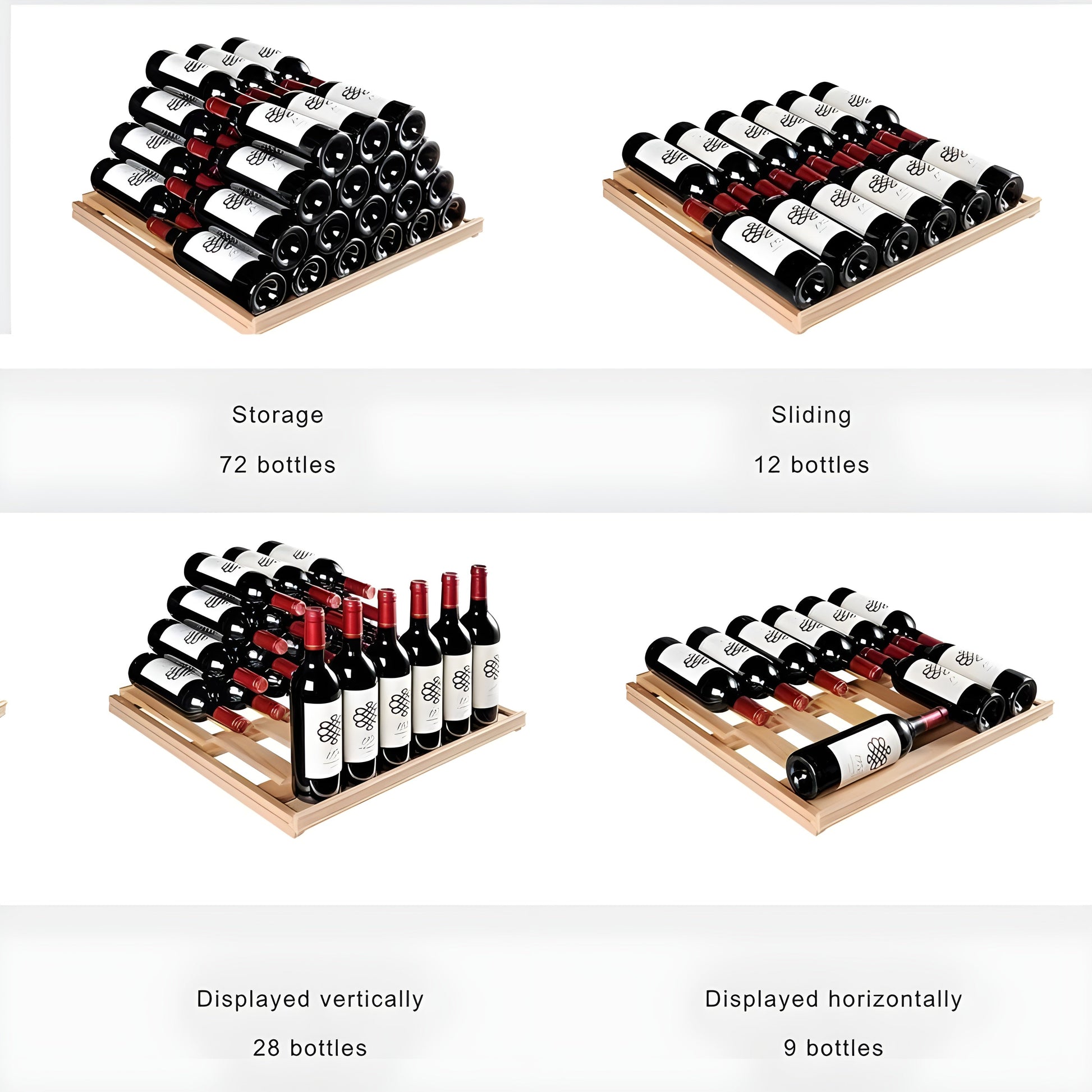 A: The wine cellar features adjustable wooden shelves that provide stable, vibration-free storage for your bottles while allowing air circulation to maintain wine quality.