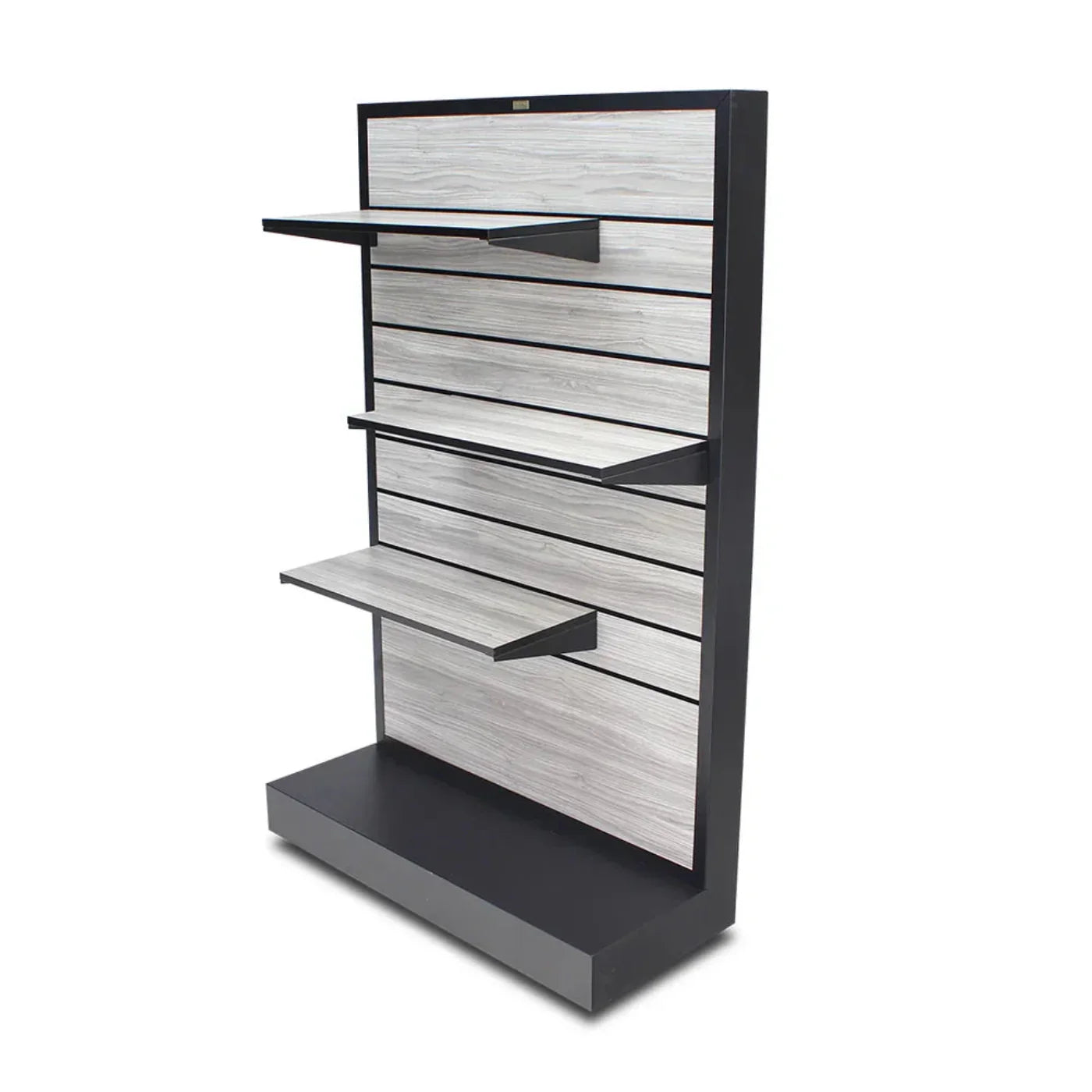 A: The frame is made from durable steel with a powder epoxy painted finish. The back panel is a laminate slat wall construction, and the shelves are laminated with natural aluminum inserts for added durability.