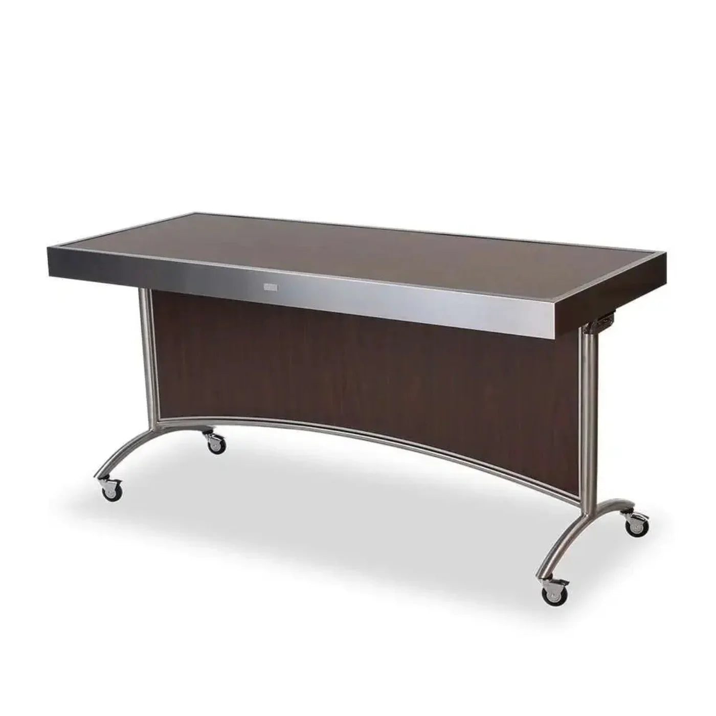 A: It’s a 30" x 72" (6-ft) mobile, nestable table featuring a stainless steel-framed laminate tabletop and stylish, modern legs.