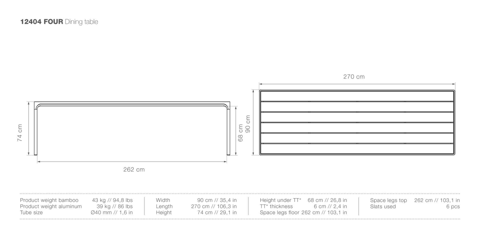 The FOUR Dining Table by Houe combines sleek Scandinavian design with durability, perfect for outdoor spaces. It features a strong powder-coated aluminum frame and a choice of natural bamboo or black aluminum slats. This outdoor dining table fits up to ten guests, making it ideal for patios, poolside areas, or restaurant terraces. Plus, its simple, clean lines match well with modern furniture and lighting styles.