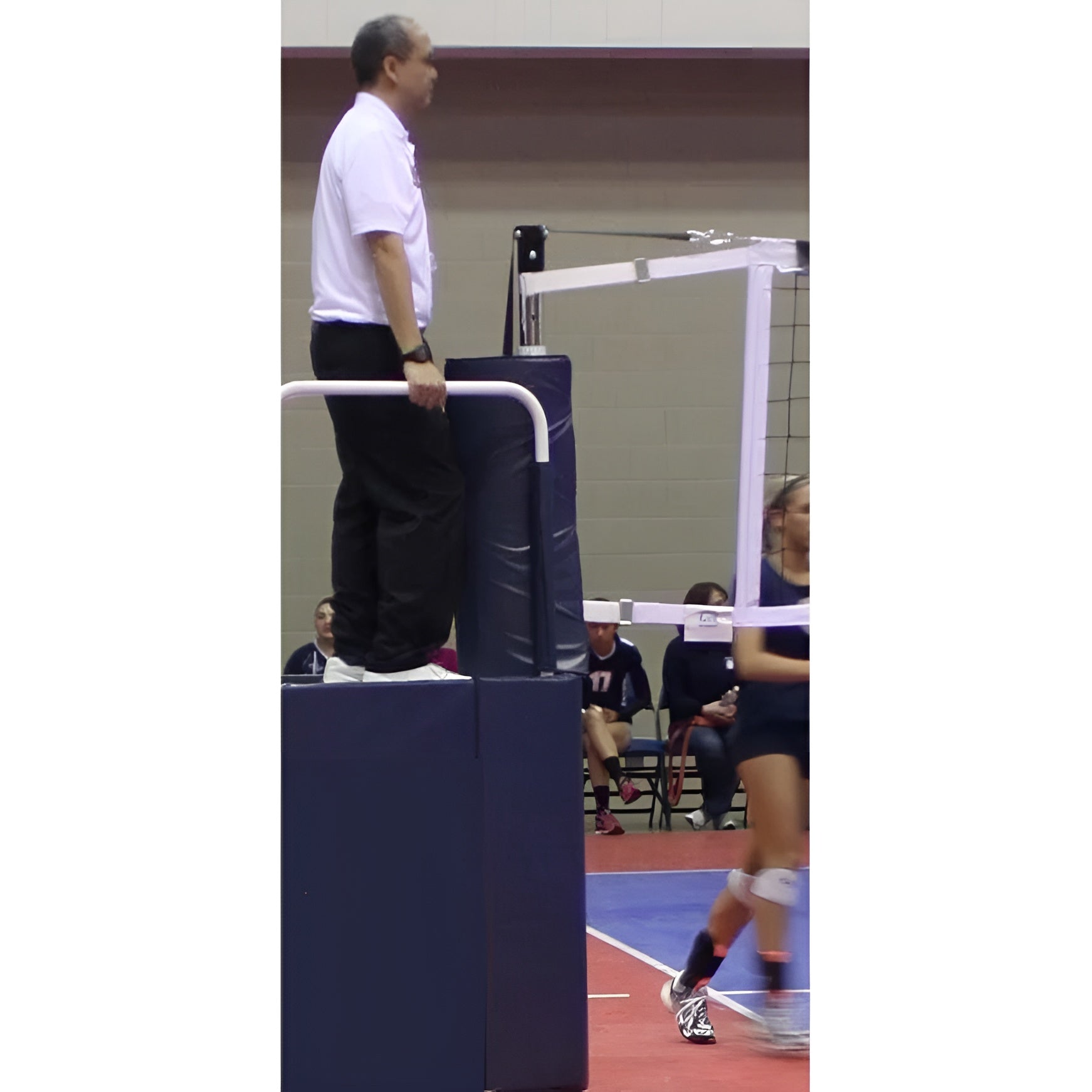Protect play surfaces with the portable GoCourt volleyball system. Voted by Athletic Directors as the top system available on the market, the 8500 system rolls into play position and easily sets up competition level play without the need for drilling sleeves into floor. System includes two portable bases with one referee stand, two padded aluminum telescopic uprights, and easy-set competition net with antennas and sideline markers. After the game winning serve or spike, simply release the brake and roll the system into storage.