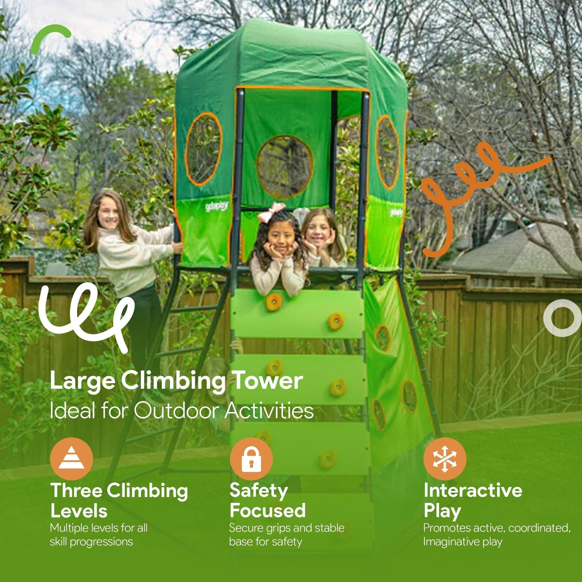 Elevate your backyard play area with the gobaplay Large Climbing Tower, a towering 8.5-foot-tall and 7.2-foot-wide structure designed to challenge and entertain children aged 6 to 10.