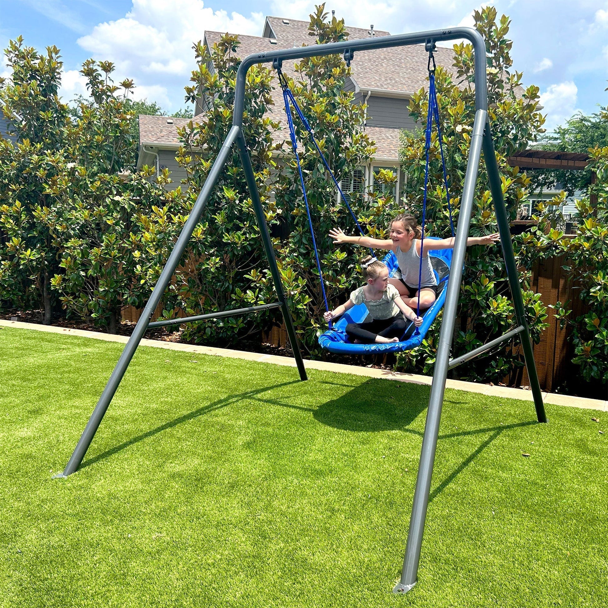 A: It includes a durable steel frame, a large blue double-platform saucer swing, and weather-resistant materials for long-lasting outdoor use. The saucer design allows multiple kids to swing together.