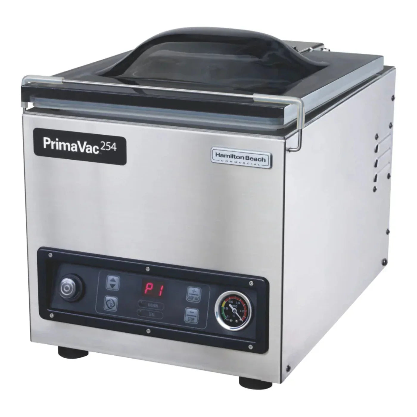 Experience the ultimate food preservation, and sous vide partner with the Hamilton Beach HVC254 PrimaVac 254 Chamber Vacuum Sealer. Equipped with a powerful 10" seal bar, the PrimaVac 254 excels in sealing a variety of foods, ensuring they remain fresh and ready for use in your restaurant, hotel, or catering business. Crafted for efficiency, it features the advanced JetAire vacuum sealing pump, capable of removing 99.9% of air and processing up to 8 cubic meters per hour. Your culinary creations will benefit from longer shelf life and enhanced flavor thanks to this state-of-the-art technology.