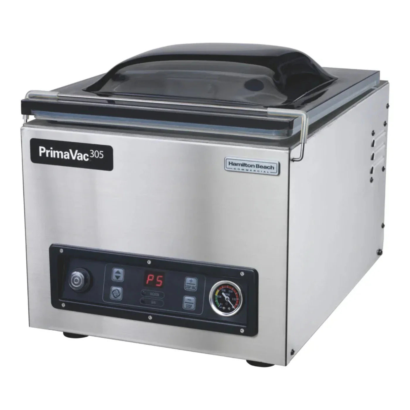 Enhance your hotel, restaurant, or catering business's kitchen efficiencies with the Hamilton Beach PrimaVac 305 Vacuum Sealer. Boasting a robust 12" seal bar, this vacuum sealer is your go-to solution for preserving ingredients, marinating meats, preparing sous-vide meals, or securely storing food. Equipped with the advanced JetAire vacuum sealing pump, it removes 99.9% of the air, vacuuming up to 12 cubic meters per hour, thereby ensuring a tightly sealed pack. Built to meet the rigorous standards of NSF International and certified by ETL for safety and reliability in North America, this vacuum sealer combines durability with high performance. Enhanced by a removable seal bar for effortless cleaning and a durable rotary pump engineered for continuous service life, it stands ready to support the busiest commercial kitchens. Further versatility is offered with 10 customizable sealing programs, enabling precise control over vacuuming, sealing, cooling, and gas insertion for different foods. Completing its premium offering with an inclusive maintenance kit and setting up for optimal operation has never been easier.