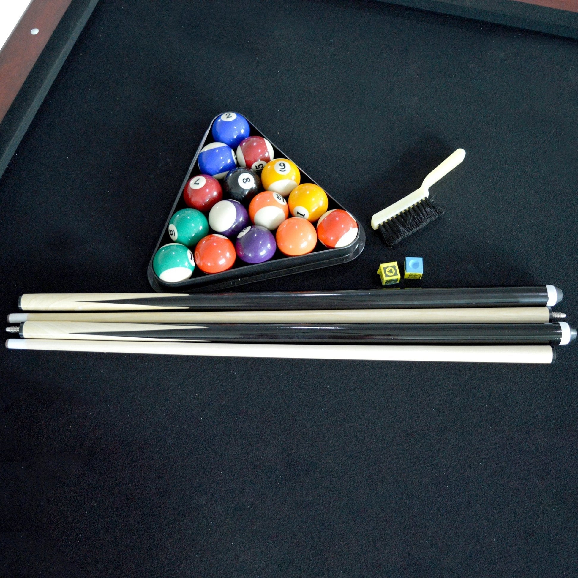 The entire frame is constructed from thick, poly-seal CARB certified MDF construction. With Cherry melamine, chrome-plated corner caps, and durable high-quality black felt, this is a luxurious addition to your home. The entire frame is supported by thick, poly-sealed pedestal-styled legs with levelers for stability. All accessories are included so start the fun now!