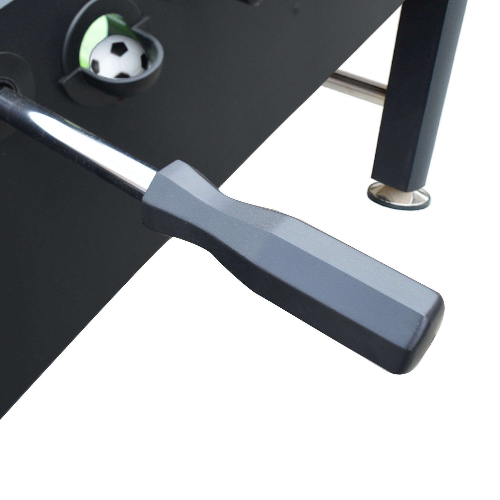 Made with a sleek, matte black design, Equalizer 56" Foosball Table offers hours of fun with a classic on-the-field look. The rigid cabinet is fortified with strong, PVC melamine. It is further supported by a streamlined post leg design. 2-in diameter chrome, cross support bars and independent leg levelers provides added stability so the playing surface is even so you can play with unprecedented performance. With life-like 3/8-in MDF playing field, ABS counter-balanced players, and E-Z spin bearings, you can enjoy a smooth, efficient game without the annoyances of technical troubles. Black solid wood, octagon-shaped, easy grip handles make passing and scoring flawless and slip-free.