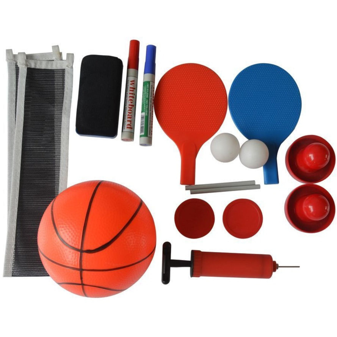 - EVERYTHING YOU NEED – Includes 2 - 2.75” strikers, 2 - 2.25” pucks, 2 table tennis paddles, 2 table tennis balls, 1 table tennis net, 1 basketball ramp/net, 1 - 7” rim, 1 - 5” basketball, 1 pump, white board and 2 white board markers