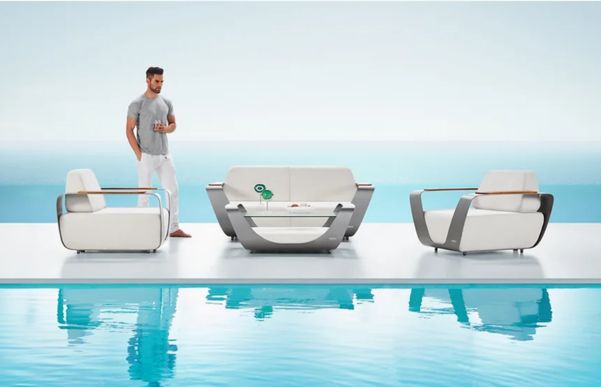 The Higold Onda seating set is designed by Pininfarina, the illustrious automotive design firm, and is the pinnacle of fine outdoor living. Pininfarina took inspiration from the dynamic elegance and purity of ocean waves. The solid, one-piece construction evokes the infinite rhythm of the tides, and the curvature of the frame mimics waves as they roll towards shore. No expense has been spared in construction β thick aluminum frames, beautiful teak, and premium cushions are supremely durable.