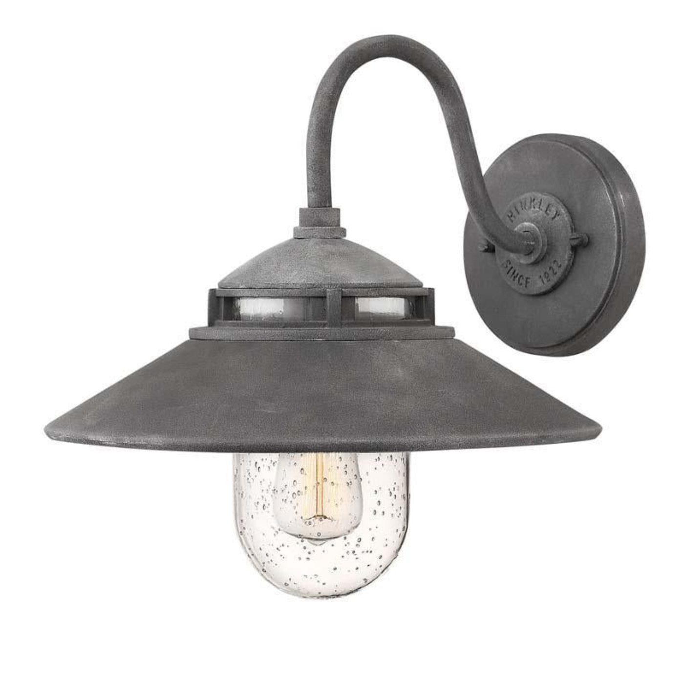Industrial-inspired Atwell recalls turn-of-the-century American factory lighting. Aged Zinc and Oil Rubbed Bronze finish options reinforce its vintage silhouette. Clear seedy glass, cast glass holder and authentic details like gooseneck arms and bespoke back plate and canopy enhance Atwells nostalgic appeal.
