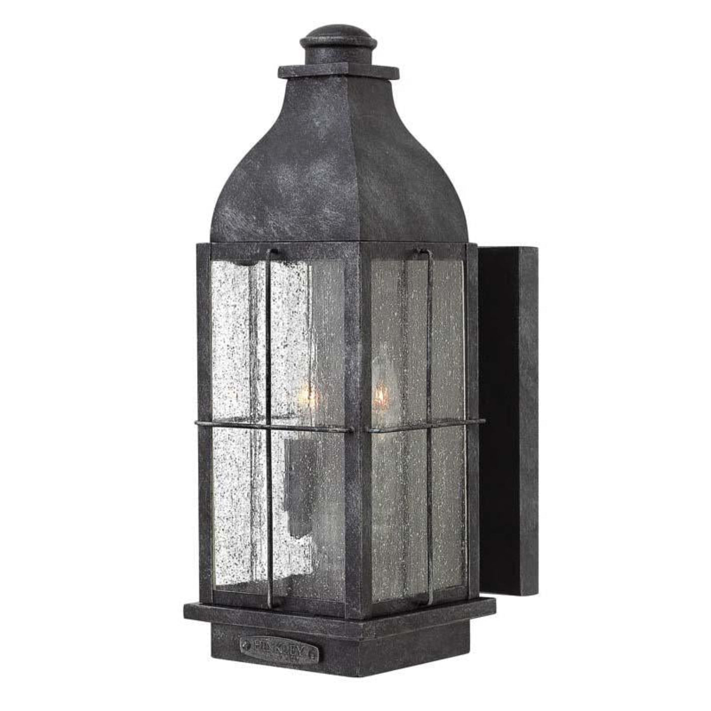 Binghams traditional style recalls a turn-of-the-century gas light reproduction. The vintage look is nautical in nature and recognizes Hinkleys origins on the shores of Lake Erie. The aluminum and brass construction features clear seedy glass and a Greystone finish, while candelabra lamping completes the authentic style. The Heritage Collection encompasses premium outdoor fixtures that pay tribute to the nostalgia of America's past while reinforcing Hinkley's philosophy of timeless, quality design.