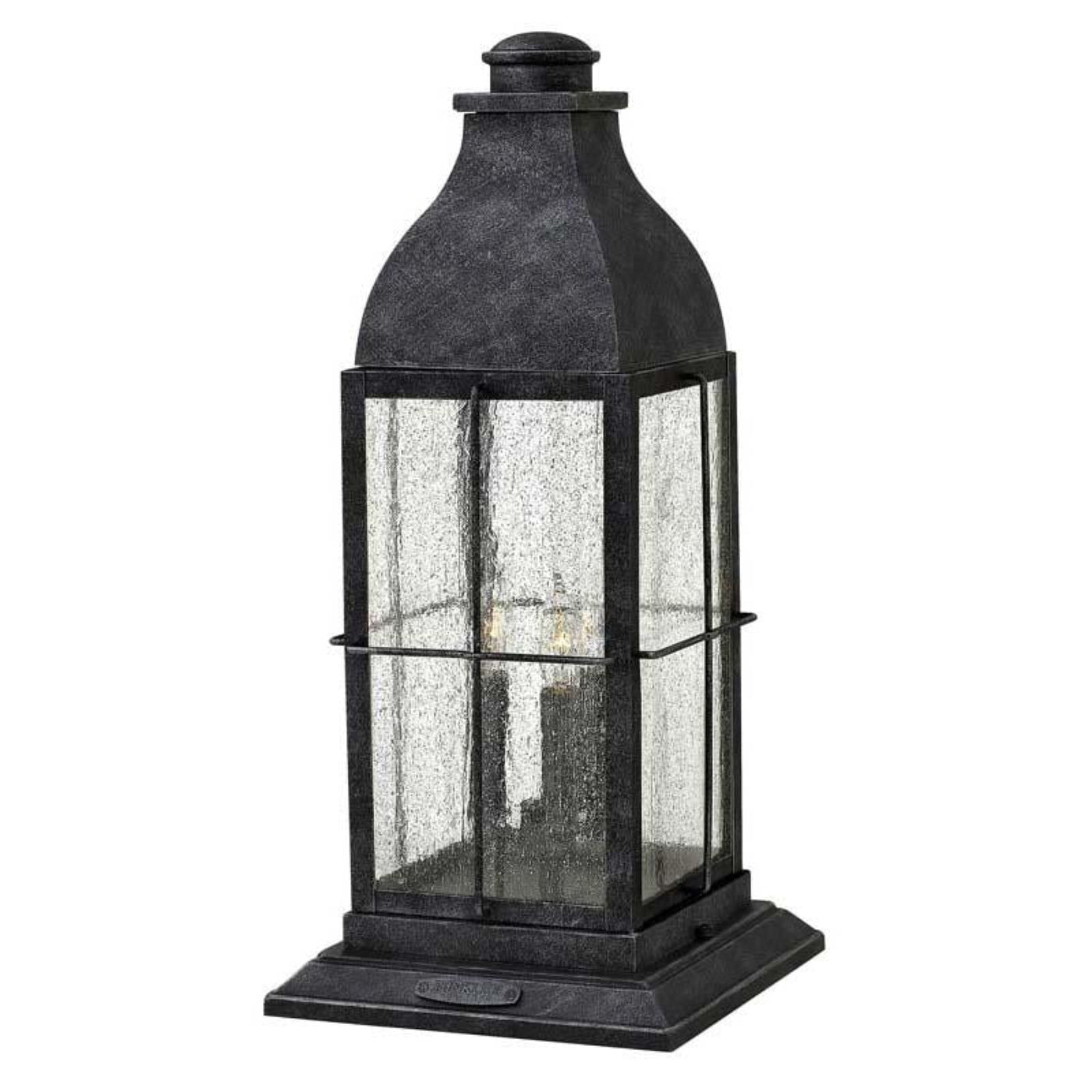 Binghams traditional style recalls a turn-of-the-century gas light reproduction. The vintage look is nautical in nature and recognizes Hinkleys origins on the shores of Lake Erie. The aluminum and brass construction features clear seedy glass and a Greystone finish, while candelabra lamping completes the authentic style. The Heritage Collection encompasses premium outdoor fixtures that pay tribute to the nostalgia of America's past while reinforcing Hinkley's philosophy of timeless, quality design.