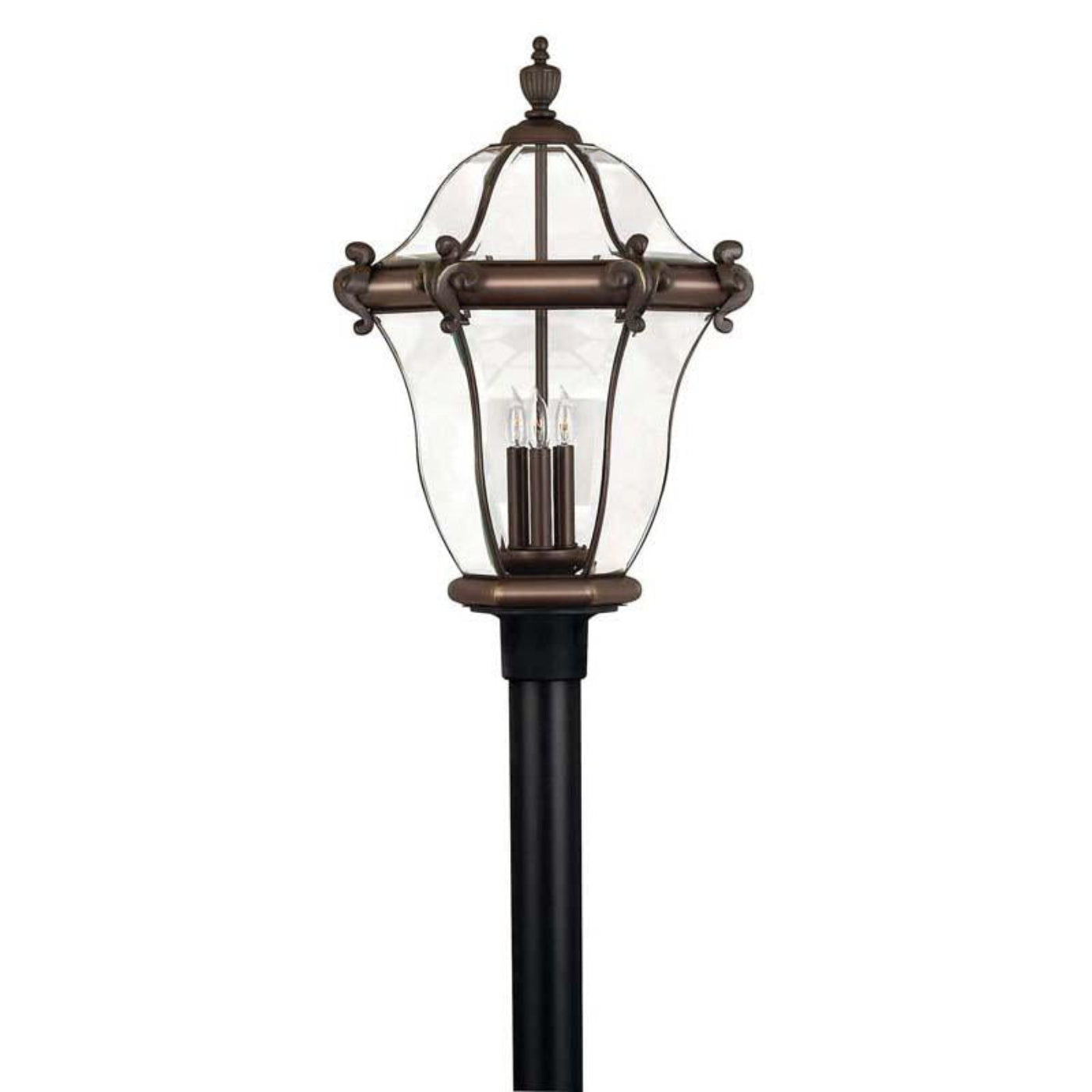 San Clementes elegant shape takes center stage with clear bent, beveled and bound glass as the central design element. Cast aluminum and brass construction complemented by exquisite cast ornamental detailing completes its captivating appeal.