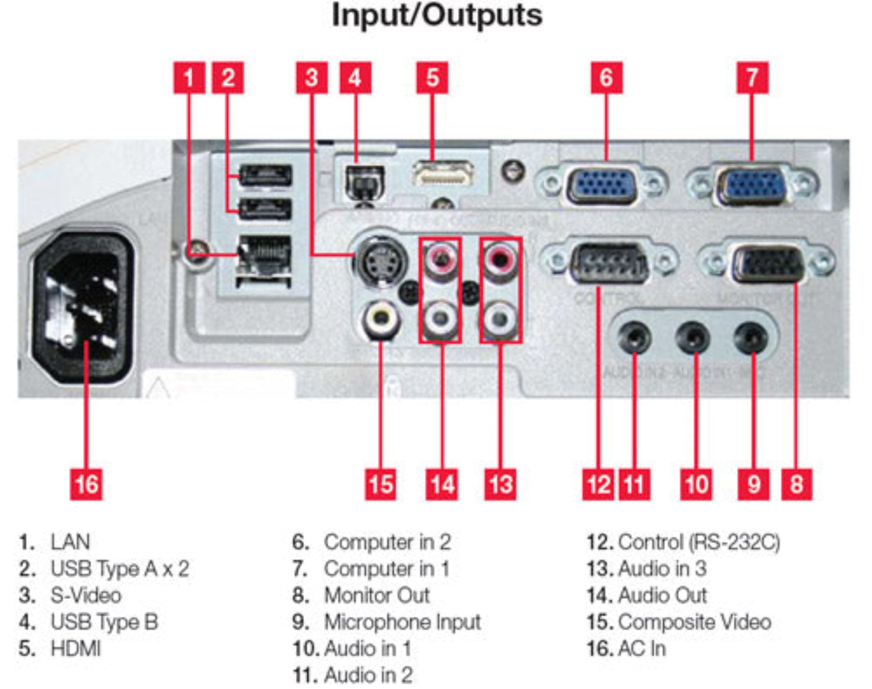 Inputs | Stereo Mini jack x1, Composite RCA x1, S-Video Jack x1, Component RCA x1, 15-pin Mini D-sub x2 |