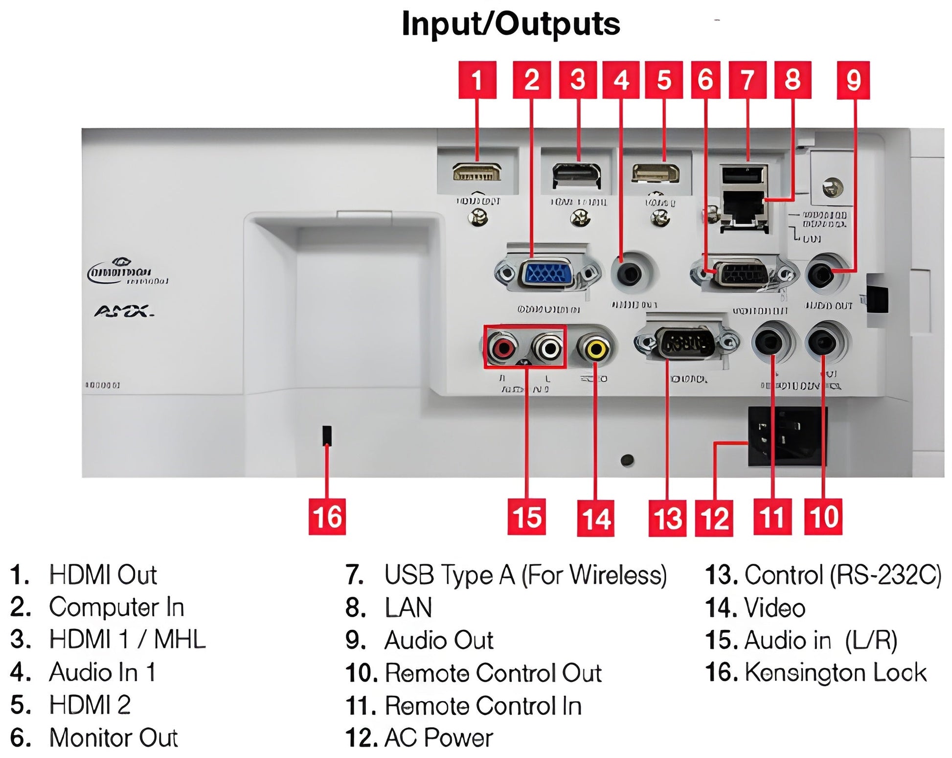 A: Yes, it’s ideal for large conference rooms, auditoriums, and other large spaces, thanks to its high brightness and WUXGA resolution.