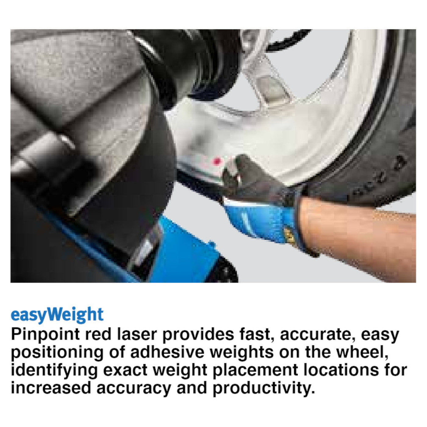 easyWEIGHT: Pinpoint red laser provides fast, accurate, easy positioning of adhesive weights on the wheel, identifying exact weight placement locations for increased accuracy and productivity.