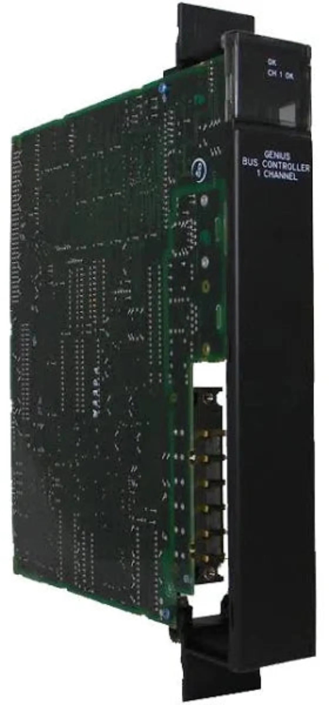 Single-Channel Genius Bus Controller: Occupies one slot in the rack, facilitating communication between the PLC CPU and up to 30 I/O devices on the Genius I/O bus.