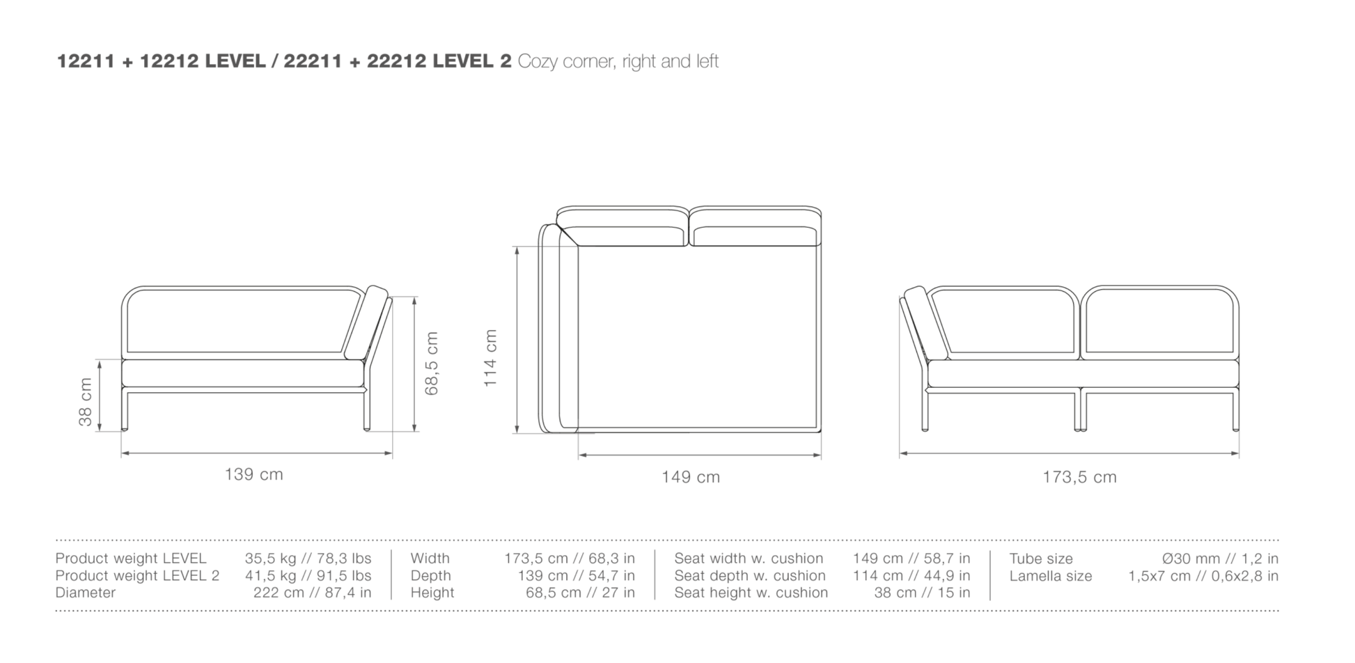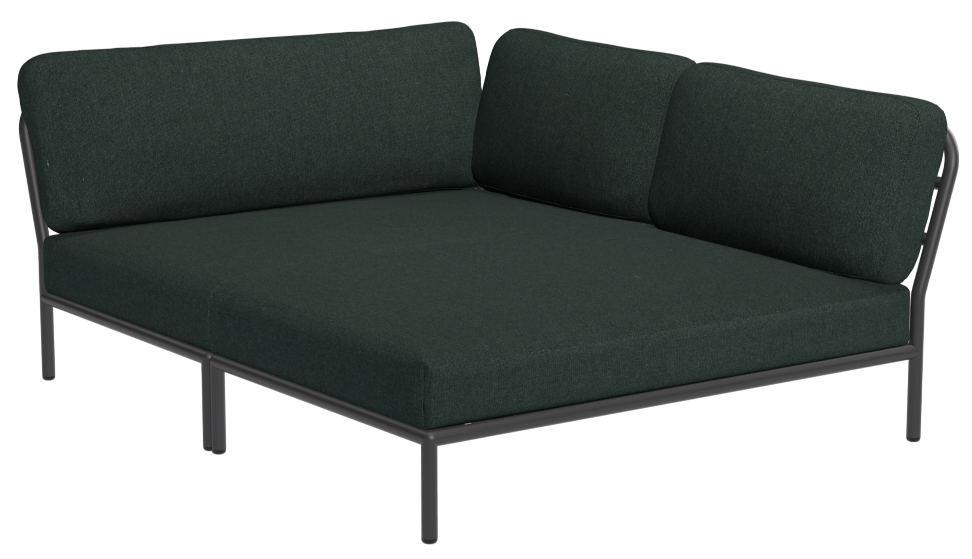 The Houe LEVEL Outdoor Cozy Corner combines modern style with comfort, creating a perfect lounge for any outdoor space. It features a durable powder-coated aluminum frame and deep cushions covered in water-resistant Sunbrella fabric. Thanks to its expanded seating depth and width, it invites relaxation. Plus, its modular design pairs well with other LEVEL pieces like the LEVEL Outdoor Chair and LEVEL Chaiselong for versatile seating options.