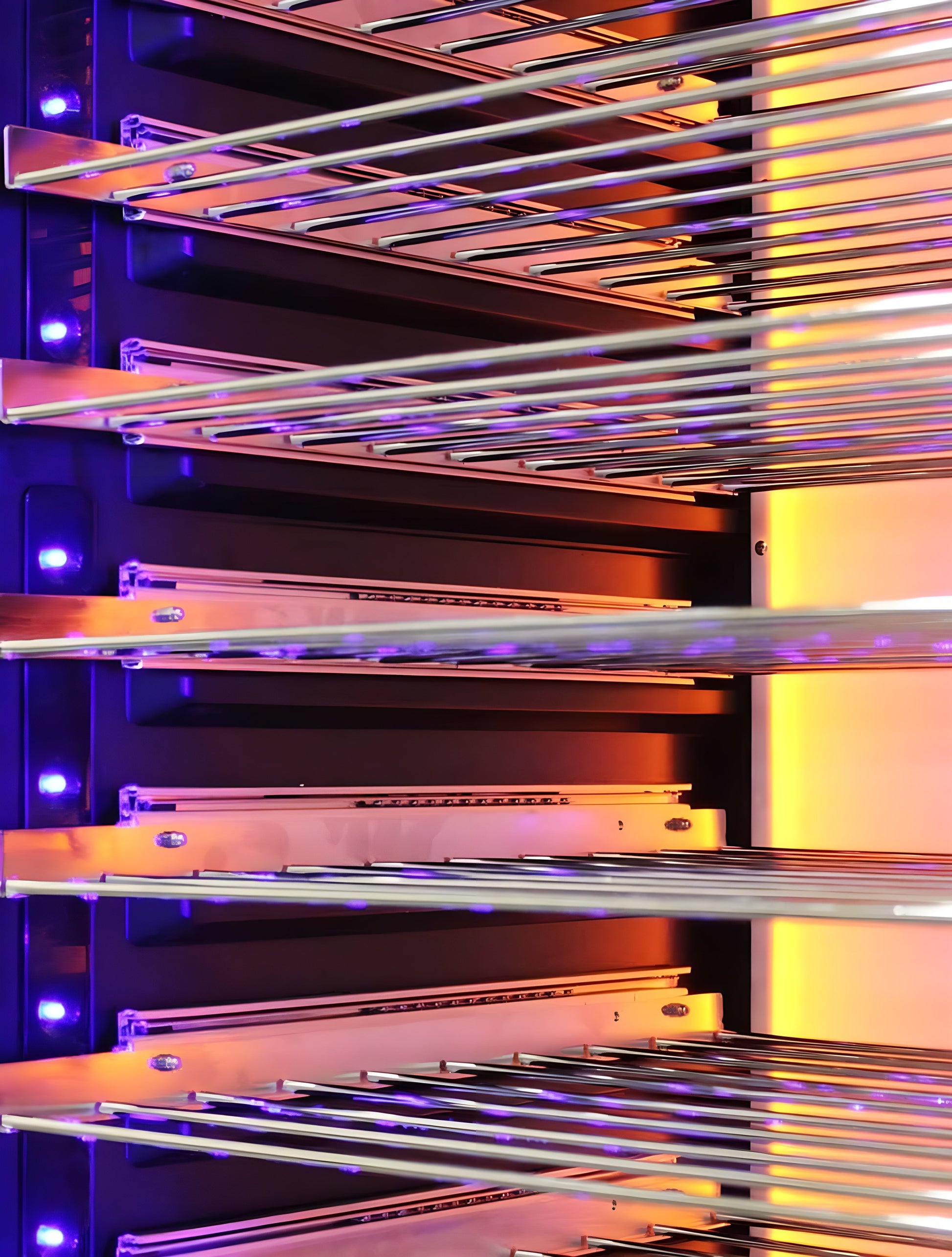 In addition to the 3 Backlit lighting options, there are side LED lights in BioBlue that line both sides of the unit. Glide out VinBo racks allow for a full view of your wine bottle labels.