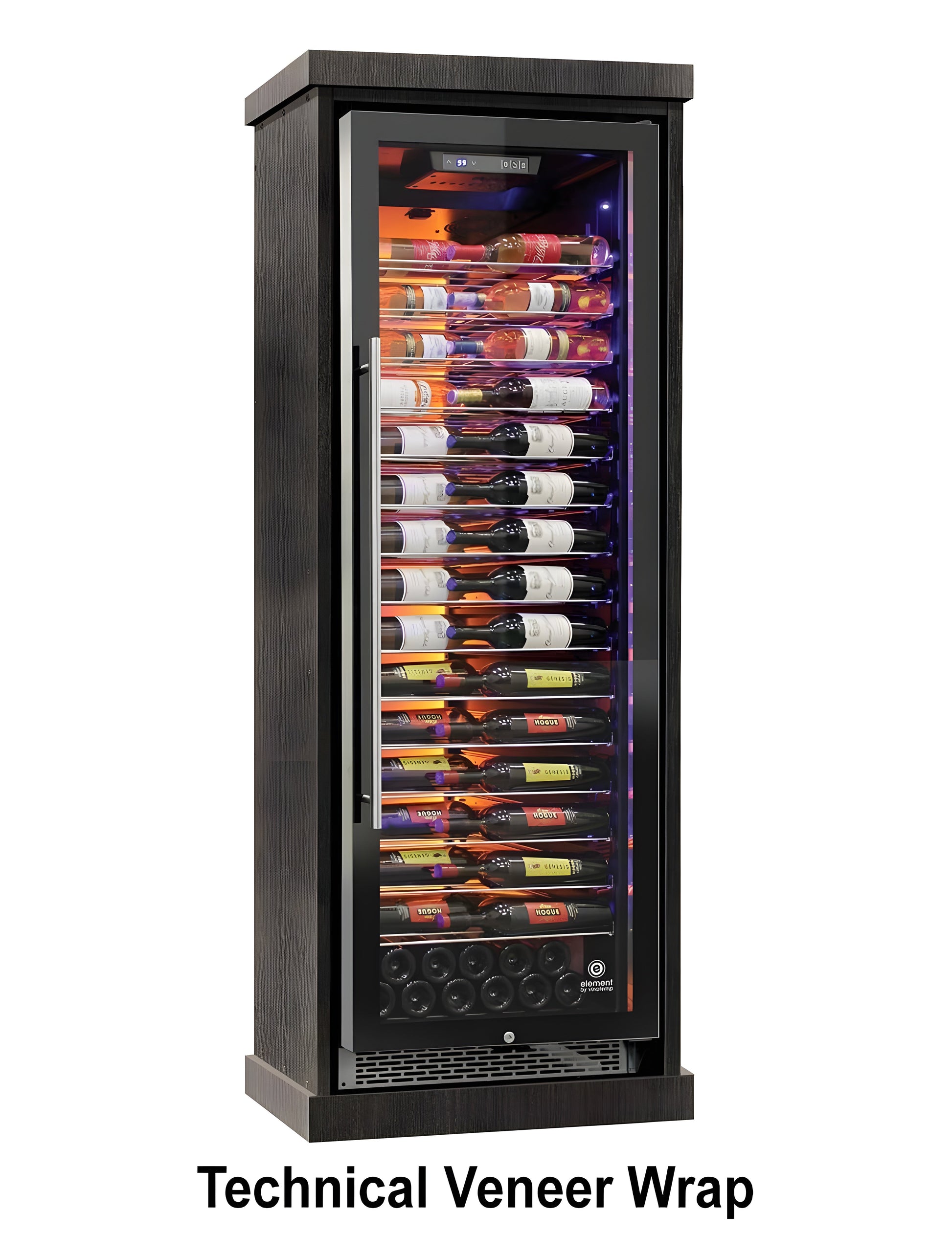 Create a stylish, contemporary look for your home with a technical veneer wrap for your wine cooler. This custom-made wood paneling wraps around your entire wine cooler to make it smoothly blend in with your furniture. Wood wrap as shown is at an additional cost. If adding this wrap, it must ship with the unit (shipping cost is included in price). Veneers are available in Okanagan, Spring Blossom, Exotic Walnut, and Chocolate. Please call 800.777.8466 for a quote.Â