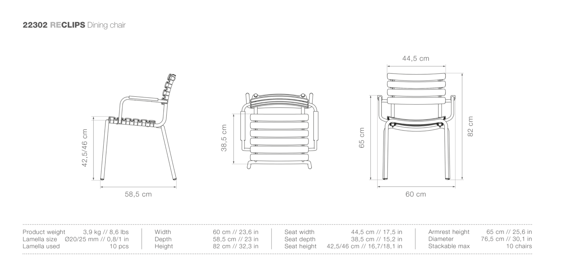 The Houe Sustainable outdoor furniture is where modern design meets sustainable living. Designed by Henrik Pedersen for Houe, this sleek chair features wide plastic slats, each made from recycled Danish household waste. The slats clip easily into a powder-coated aluminum frame, creating a clean, minimal look. As a result, the ReCLIPS Outdoor Dining Chair offers durability, comfort, and eco-conscious appeal in one elegant package.