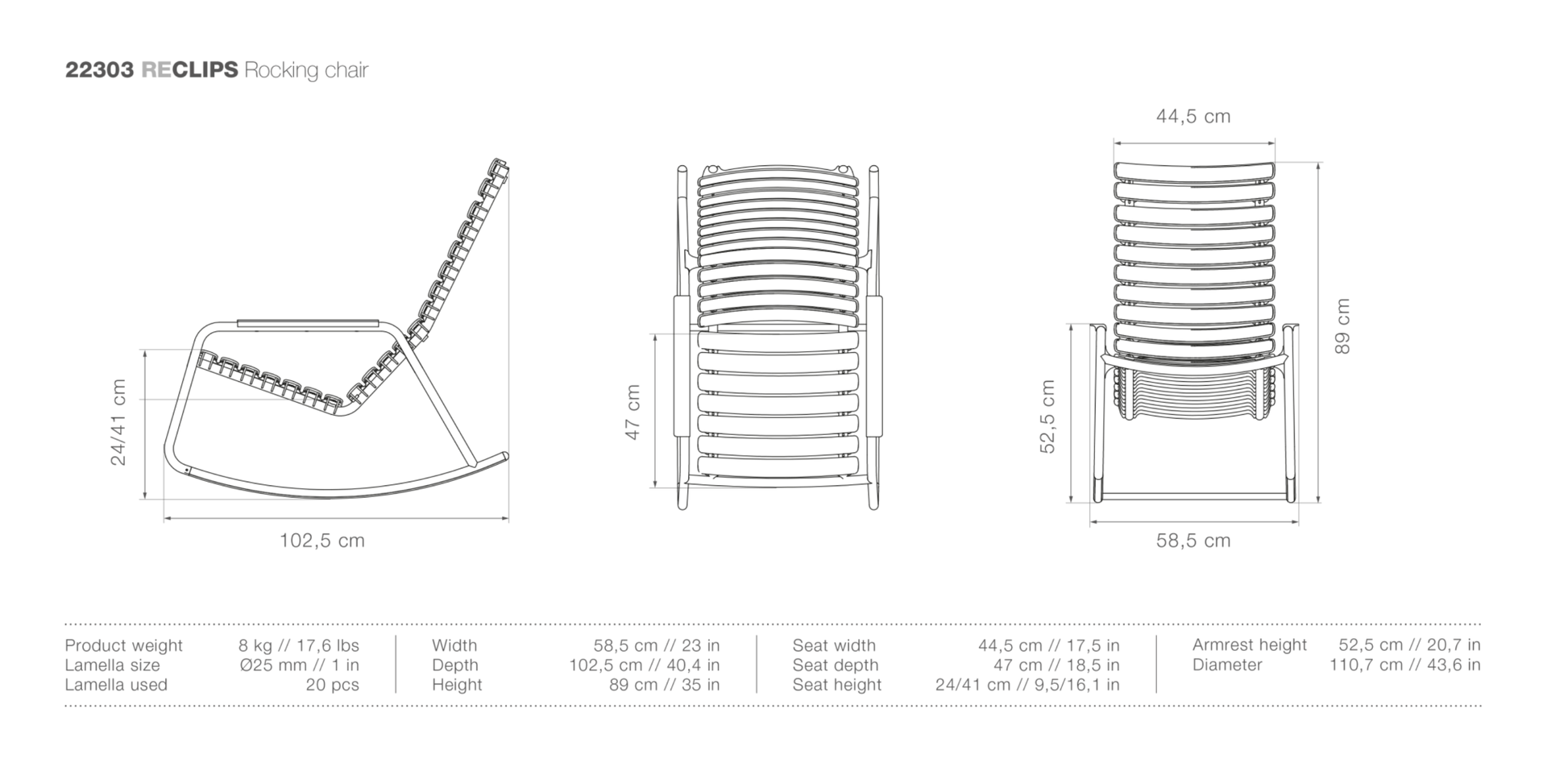 In addition to its sleek appearance, the Houe ReCLIPS Outdoor Rocking Chair is easy to assemble. The slats simply clip into place, which means setup is quick and hassle-free. Furthermore, the chair’s ergonomic back and sturdy armrests provide lasting comfort. Whether used alone or paired with a matching footrest or teak outdoor furniture, it invites you to unwind outdoors in style—without compromising sustainability.
