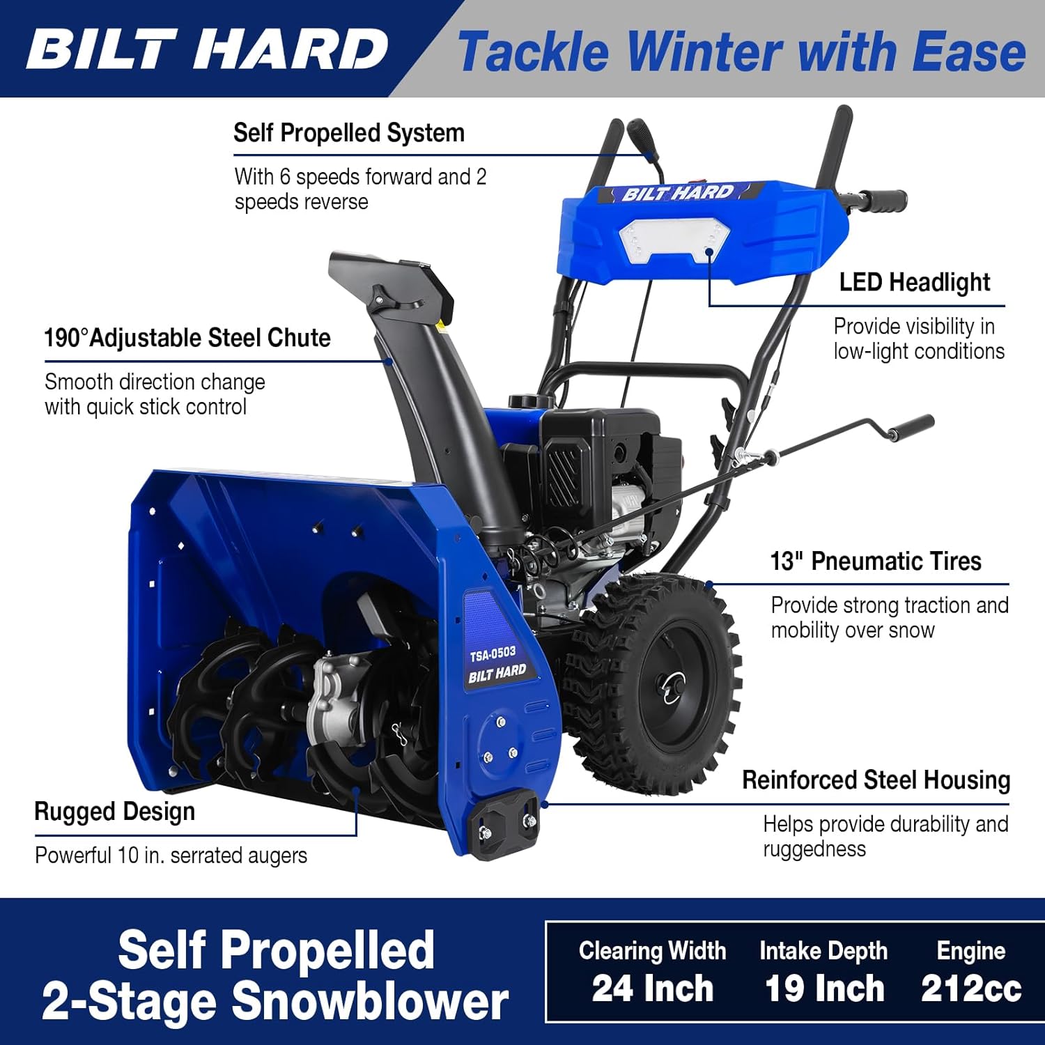 Q: What are the key features of the BILT HARD 24" Gas-Powered Snow Blower?
