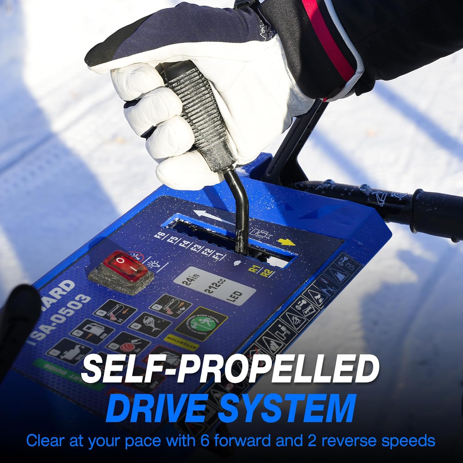 A: This 2-stage snow blower features a powerful 212cc engine, a 24-inch clearing width, and a self-propelled design with 6 forward & 2 reverse speeds. It includes an electric start, LED headlight, and 13" snow terrain tires for enhanced traction.