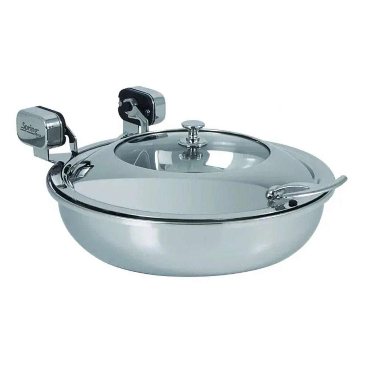 A: The Spring USA 2472-6/36 is a round, stainless steel buffet server with a 4-quart capacity. It features a glass top and an all-angle axle system, allowing the lid to remain open at various positions for convenient serving.