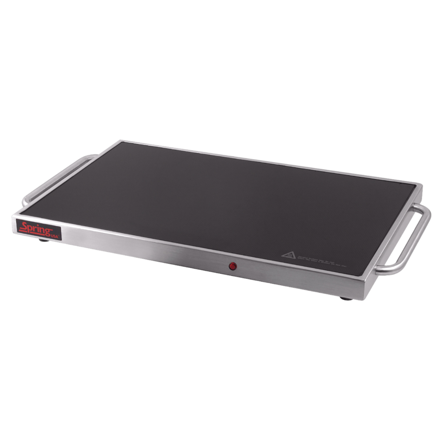 Spring USA warming tray or warming shelf holds prepared food at proper temps with a low-profile design that puts food front & center. The ST-1220 Warming Tray is just 1 3/4" high and offers even heat distribution for a variety of serving options including, heat-safe vessels, grab & go containers, and even serving without vessels for food items such as sandwiches, wraps, cookies, and more. Stainless steel construction with high-temp non-stick coating and a tempered glass surface that is easy to wipe clean. ETL-rated for sanitation. Pair with heat lamps for top to bottom warming. Only 1.91 amps, the warming tray is safe to use in areas with reduced power or with battery power (try with Spring Volt). The low power draw allows 6 trays to be daisy-chained together and plugged into one 15-amp circuit. Without heavy metal heating elements like other warming shelves or countertop heating, the ST-1220 Warming Tray is lightweight and efficient in transferring heat by uitilizing high-quality conductive glass. 24"W x 13-3/4"D x 1-3/4"H tempered glass surface up to 200 ° surface temperature power switch & temperature adjustment knob on operator's side round handles, silver stainless steel body 110-120v/60/1-ph, 230 watts, 2.1 amps NEMA 5-15P, 6' cord cETLus, ETL-Sanitation, CSA