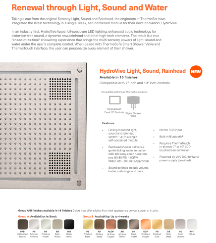 In an industry first, HydroVive fuses full-spectrum LED lighting, enhanced audio technology for distortion-free sound, a dynamic new rainhead and other high-tech elements. The result is a true "ahead-of-its-time" showering experience that brings the multi-sensory powers of light, sound and water under the user's complete control. When paired with ThermaSol's Smart Shower Valve and ThermaTouch interface, the user can personalize every element of their shower.