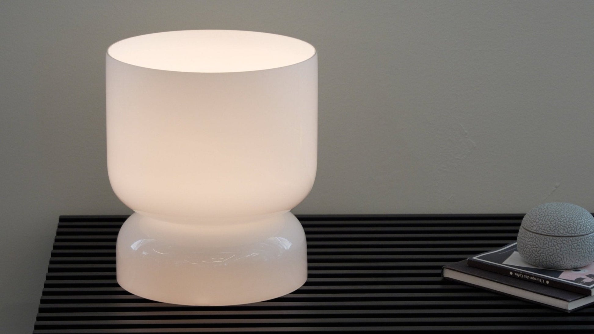 A: A modular LED table lamp featuring stacked blown-glass shades that create warm, diffused light with sculptural appeal.